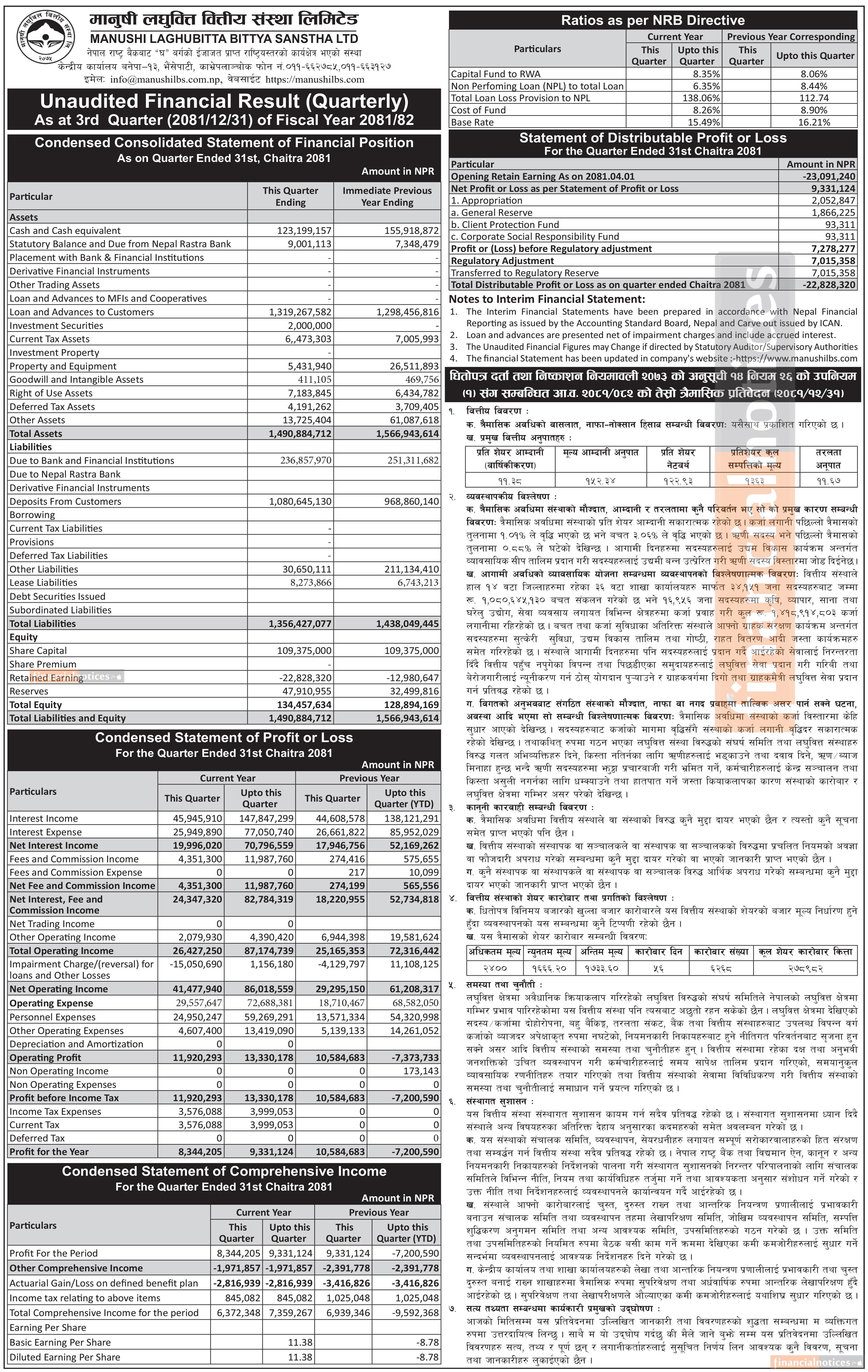 मानुषी लघुवित्तको तेस्रो त्रैमासमा खुद नाफा ९३ लाख ९१ हजार रुपैयाँ