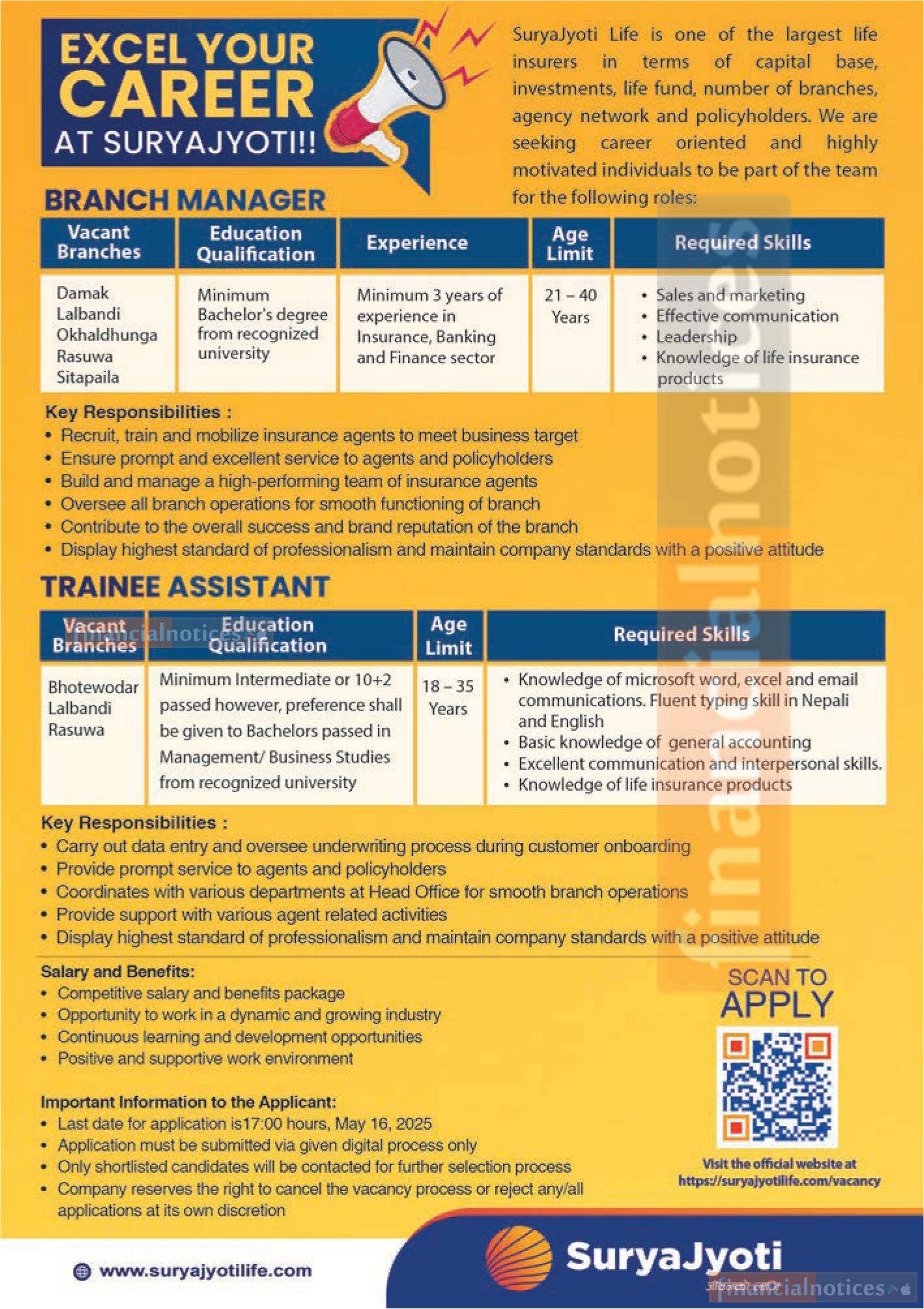 Kathmandu, May 7, 2025 — SuryaJyoti Life Insurance, one of Nepal’s largest life insurers, has announced a fresh wave of employment opportunities as it seeks highly motivated and career-oriented individuals to join its growing team. The company is hiring for the positions of Branch Manager and Trainee Assistant in various branch offices across the country.