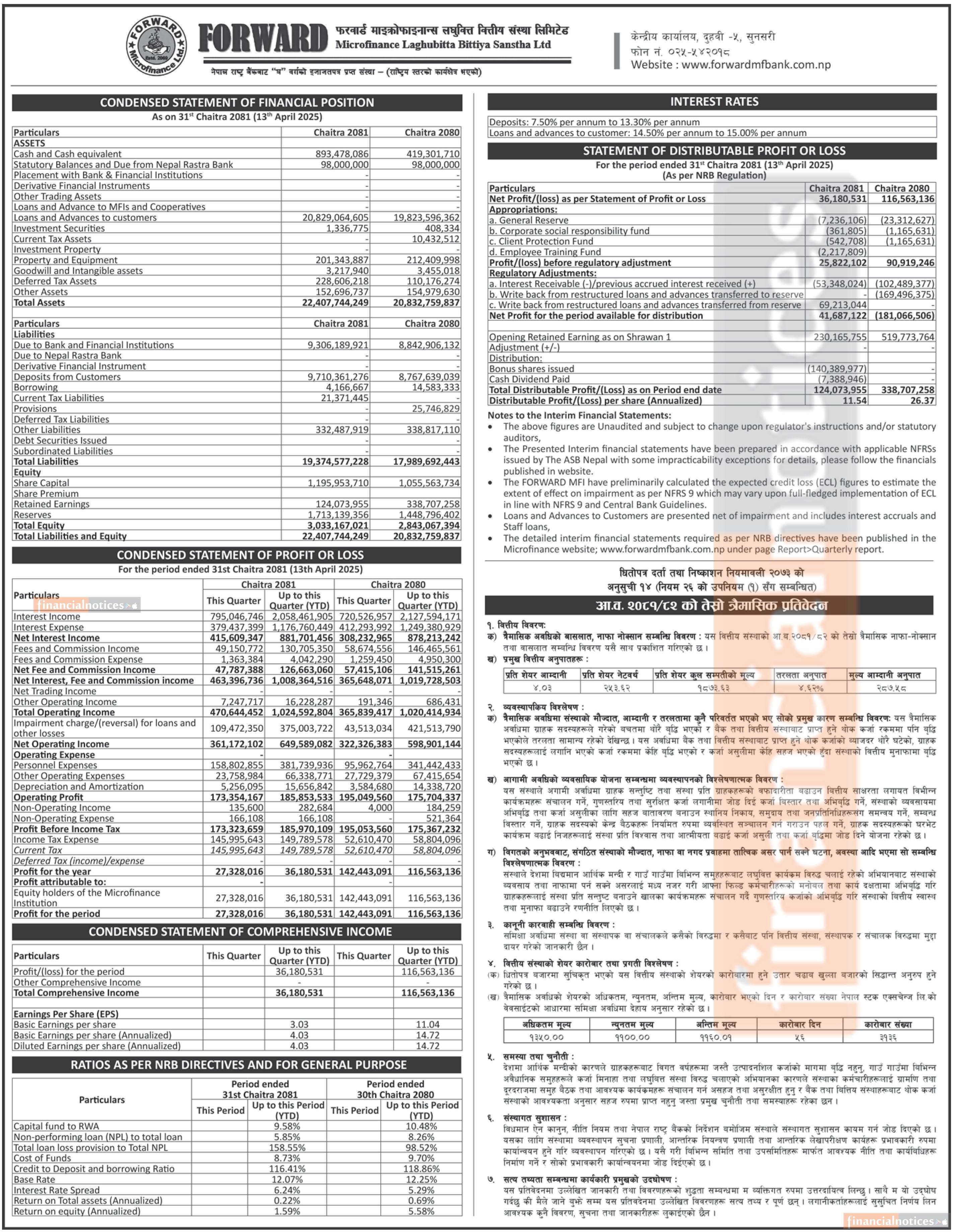Forward Microfinance Laghubitta has posted a net profit of Rs 36.18 million and published its 3rd qu