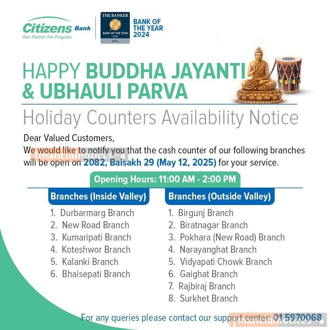 Holiday counters availability notice for Buddha Jayanti & Ubhauli Parva