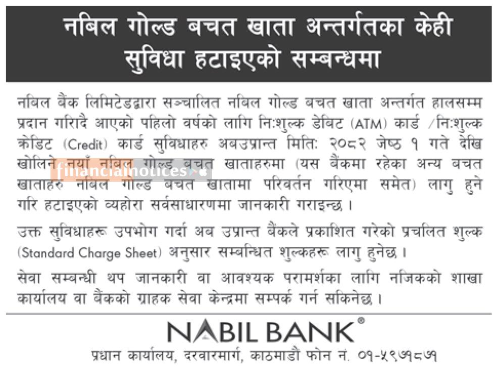 नविल गोल्ड बचत खाता अन्तर्गतका केहि सुविधा हटाइएको सम्बन्धी सूचना