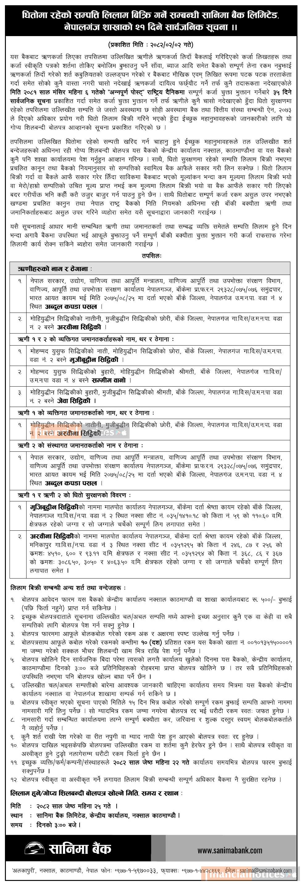 धितोमा रहेको सम्पत्ति लिलाम बिक्री गर्ने सम्बन्धी सानीम बैंकको सूचना -