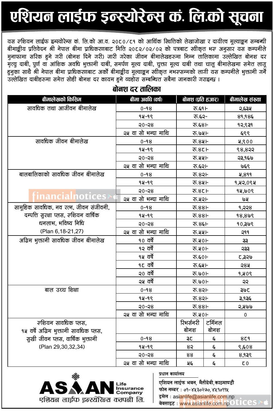 एसियन लाइफ इन्सुरेन्सको बोनस दर सम्बन्धी सूचना
