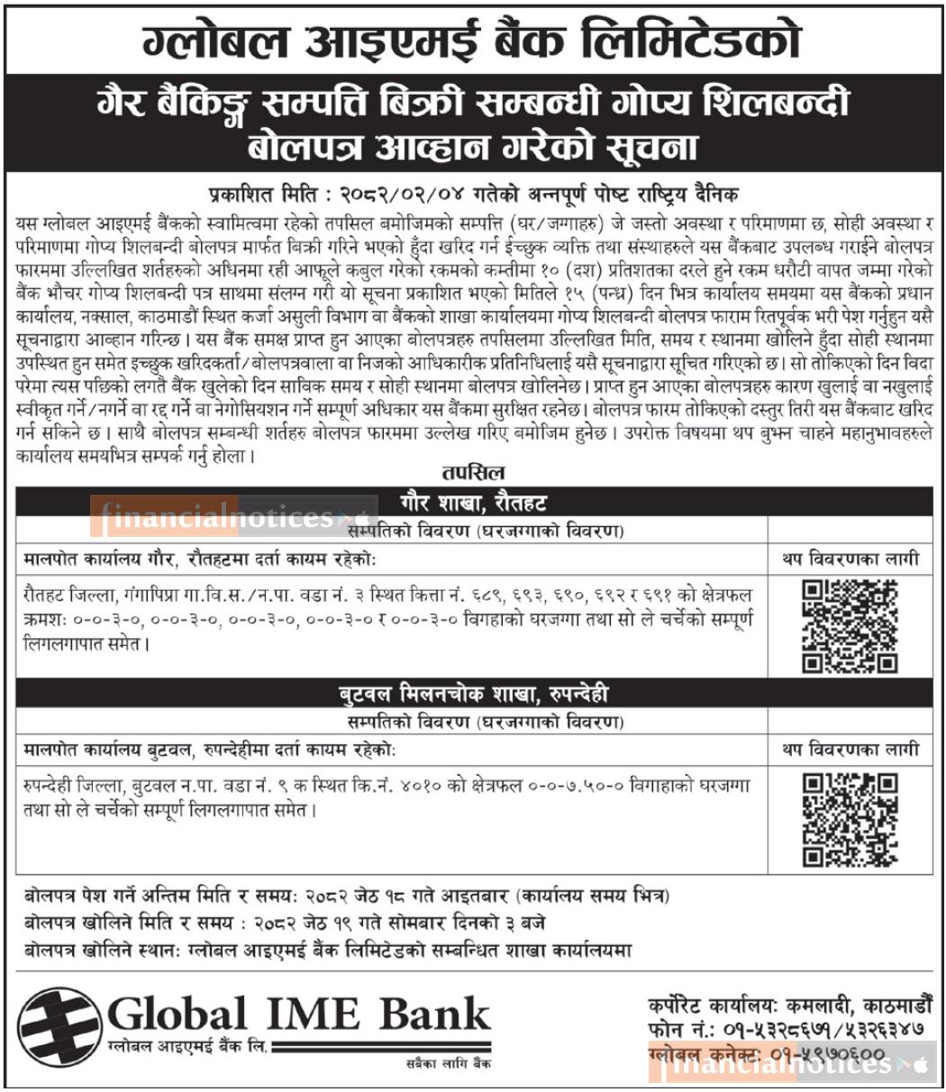गैह्र बैंकिङ्ग सम्पत्ति बिक्री सम्बन्धी शिलबन्दी बोलपत्र आव्हान गरेको सूचना