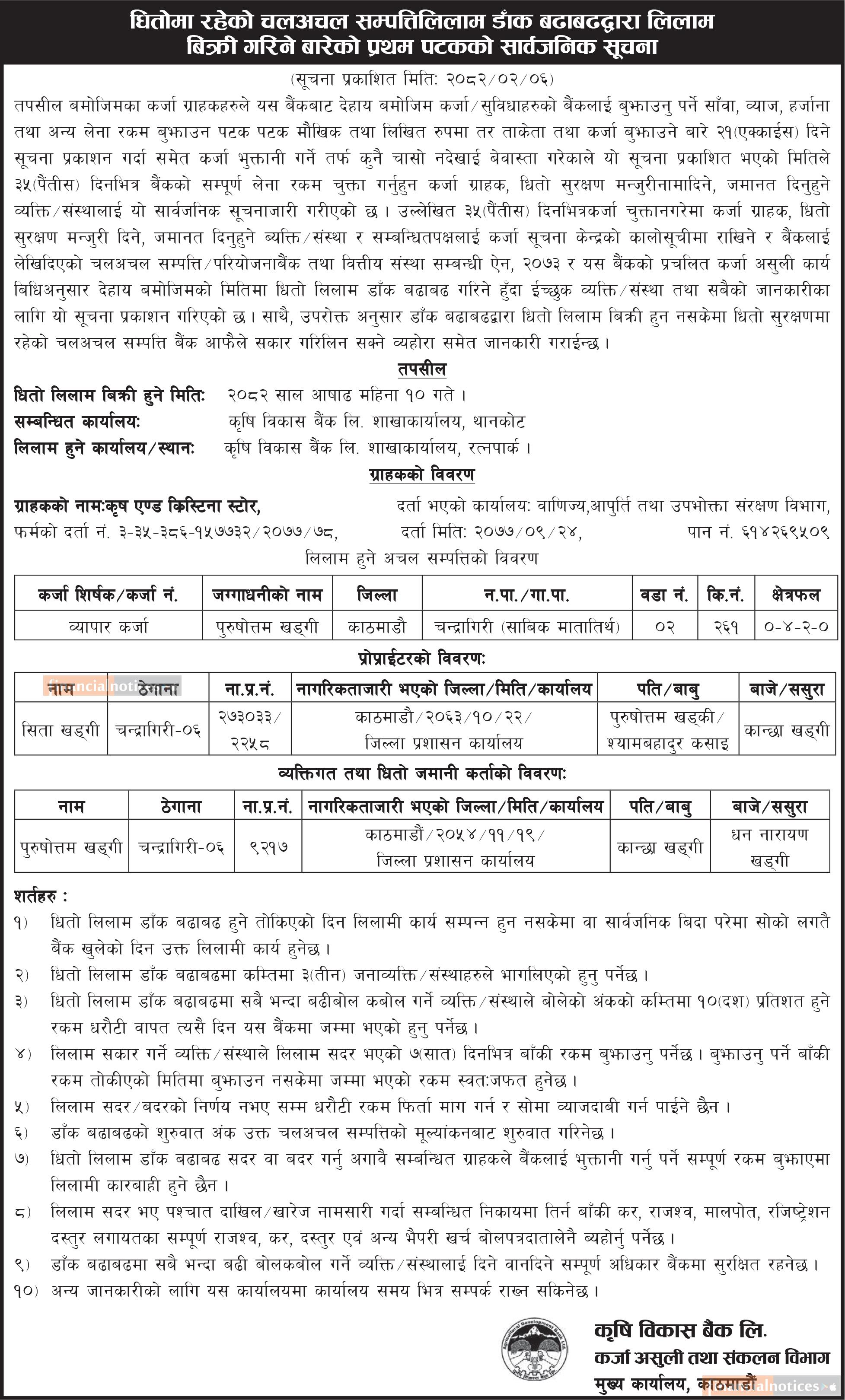 धितोमा रहेको चलअचल लिलाम डाँक बढाबढद्धारा लिलाम बिक्री गर्ने बारेको सूचना