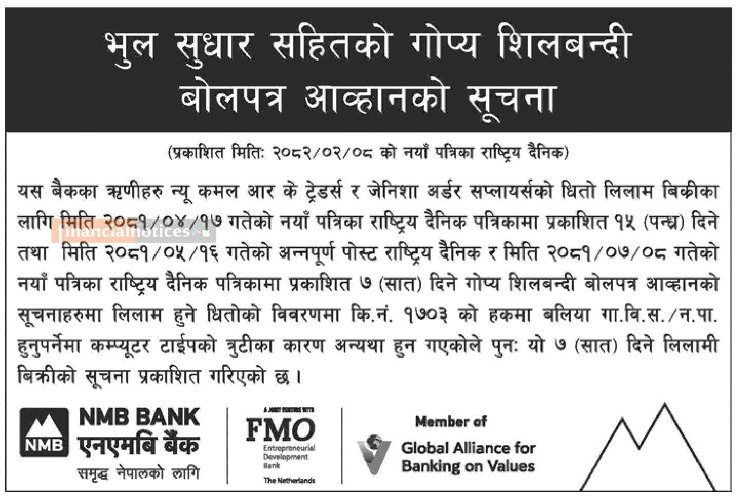 भुल सुधार सहितको गोप्य शिलबन्दी बोलपत्र आव्हानको सूचना