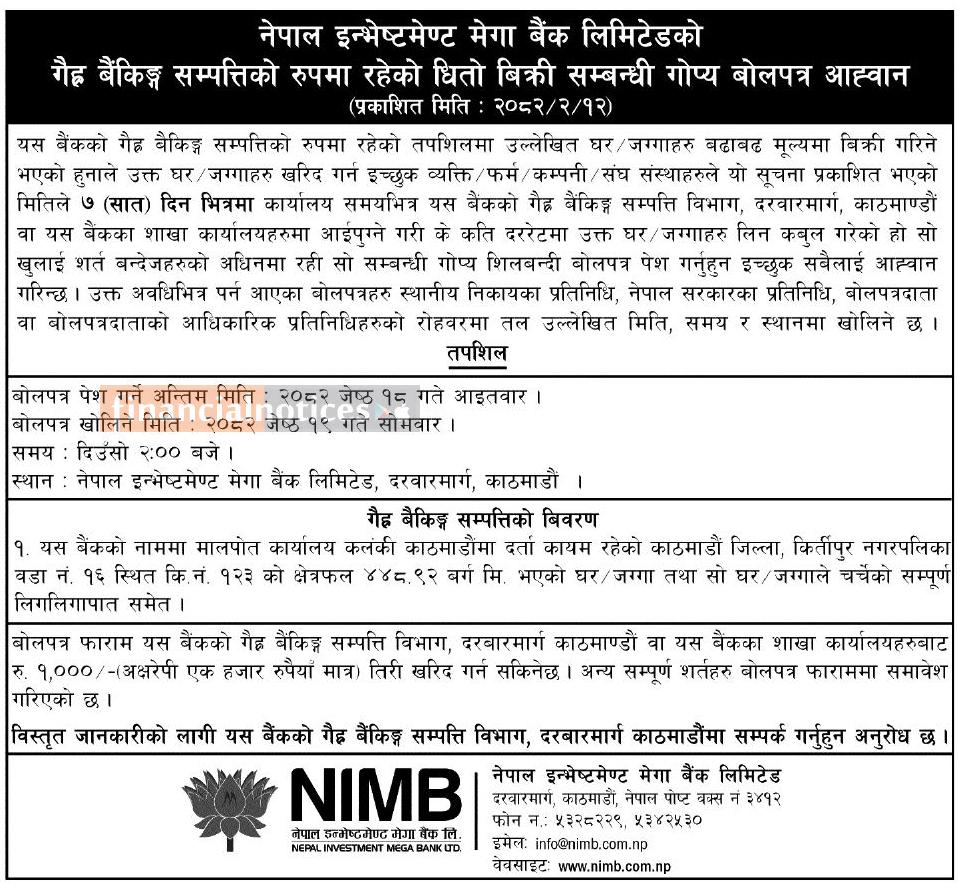गैह्र बैंकिङ्ग सम्पत्तिको रुपमा रहेको धितो बिक्री सम्बन्धी गोप्य शिलबन्दी बोलपत्र आव्हानको सूचना