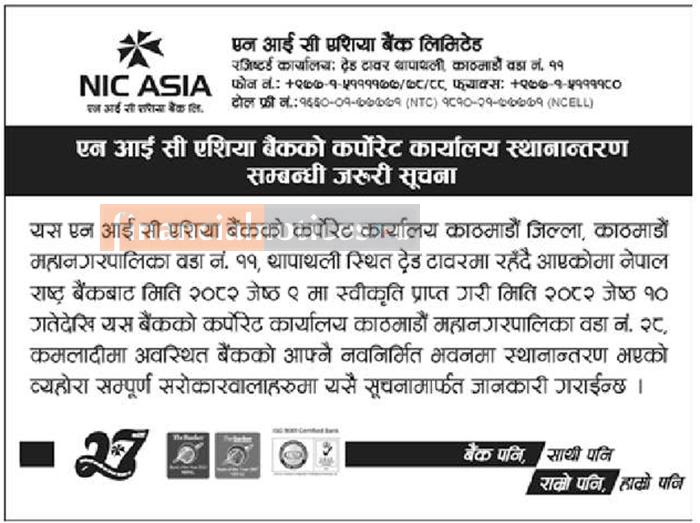 एनआईसी एसिया बैंकको कर्पाेरेट कार्यालय स्थानान्तरण सम्बन्धी सूचना