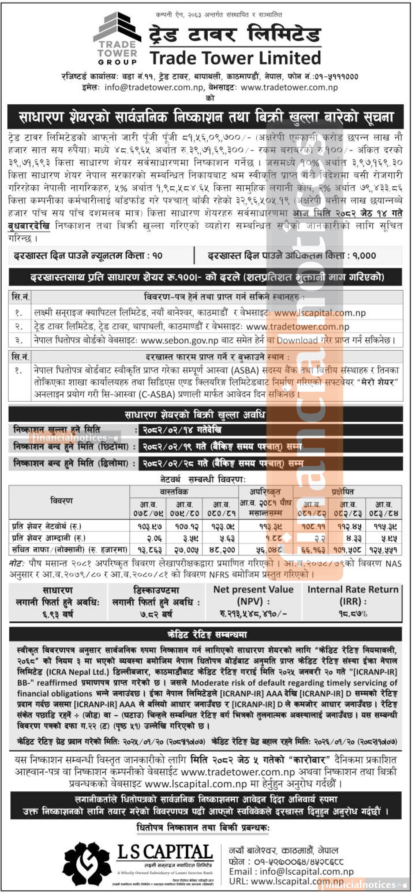 ट्रेड टावरको आइपीओमा सर्वसाधारणले आजदेखि आवेदन दिन सकिने सम्बन्धी सूचना