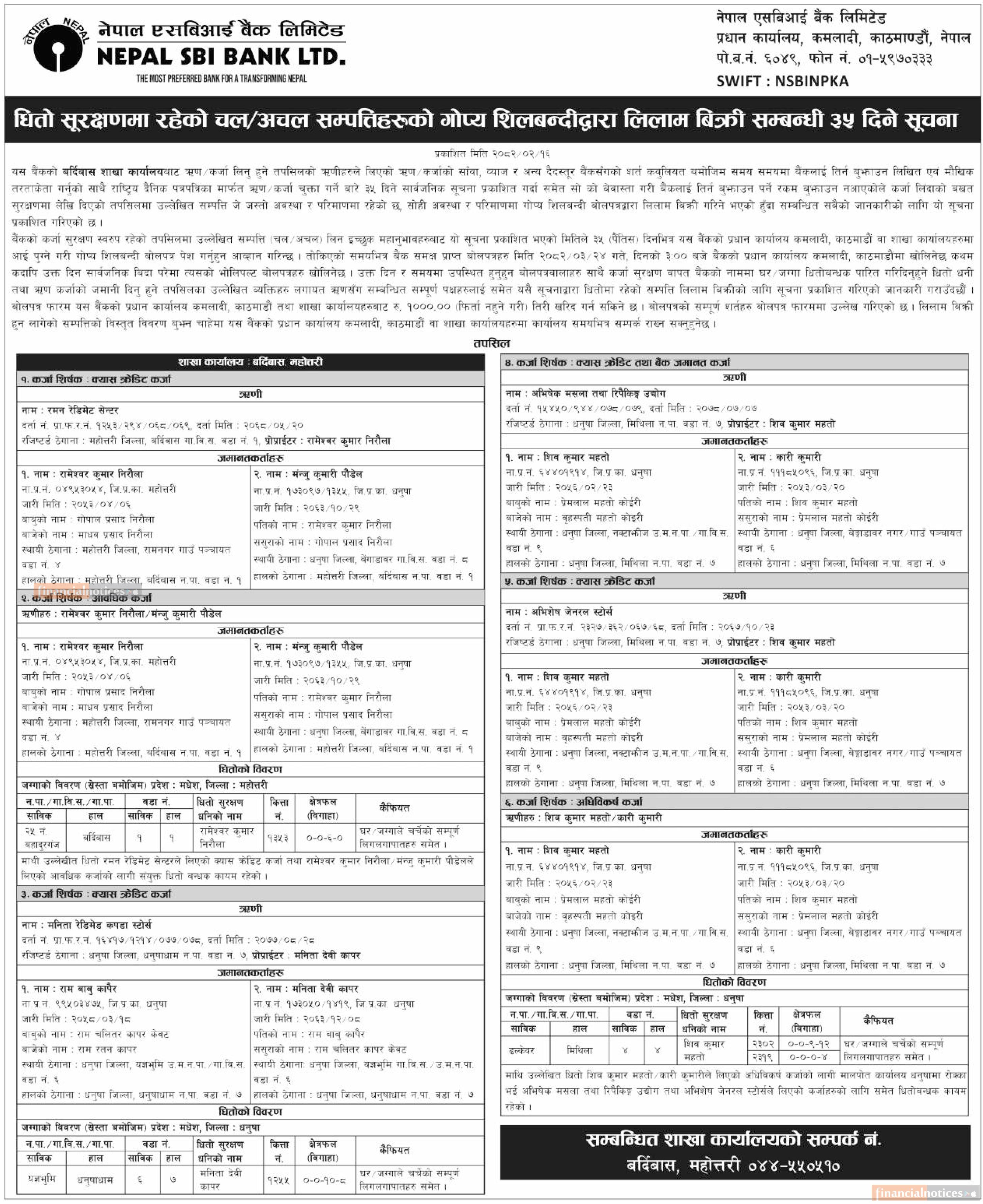 धितो सुरक्षणमा रहेको चल अचल सम्पत्तिहरुको गोप्य शिलबन्दीद्धारा लिलाम बिक्रीको सम्बन्धी सूचना