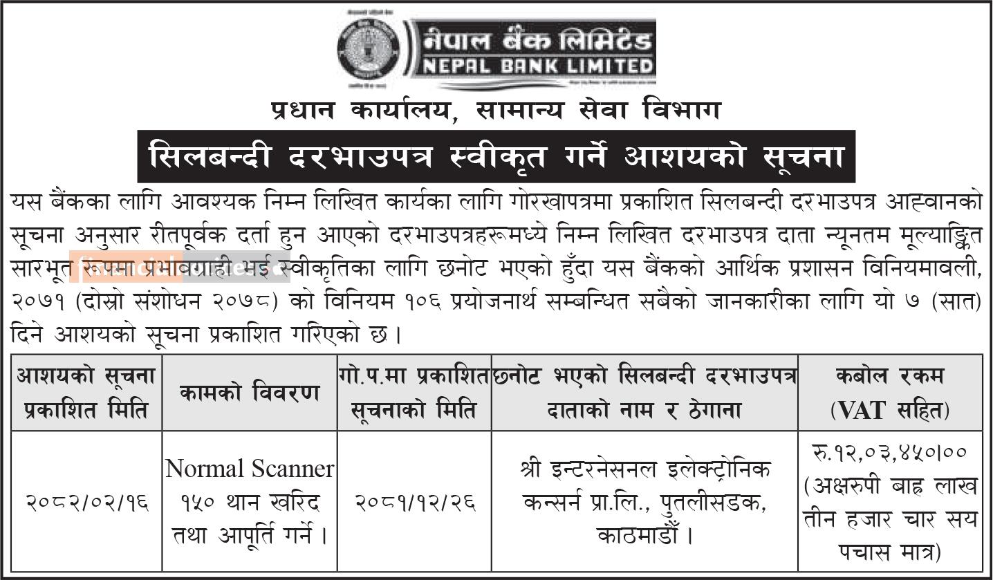 शिलबन्दी दरभाउपत्र स्वीकृत गर्ने आशयको सूचना