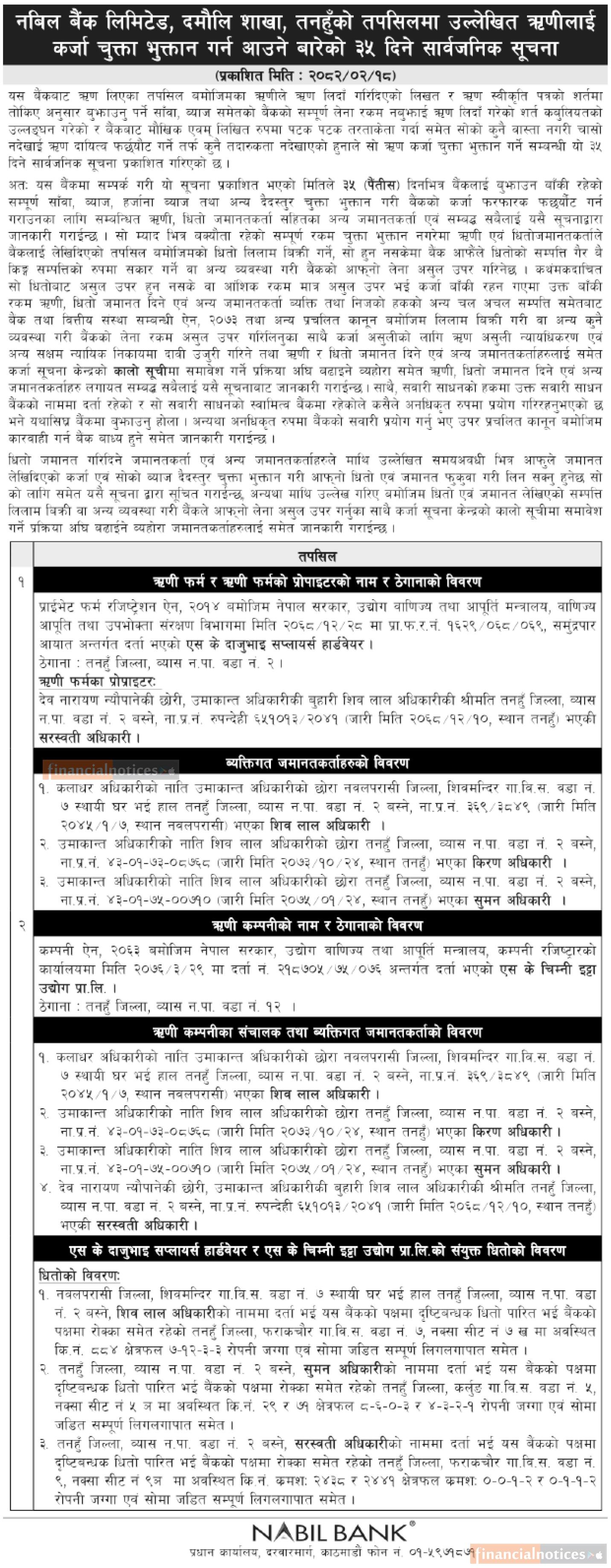तनहुँको ऋणीहरुलाई कर्जा चुक्ता भुक्तान गर्न आउने बारेको ३५ दिने सार्वजनिक सूचना