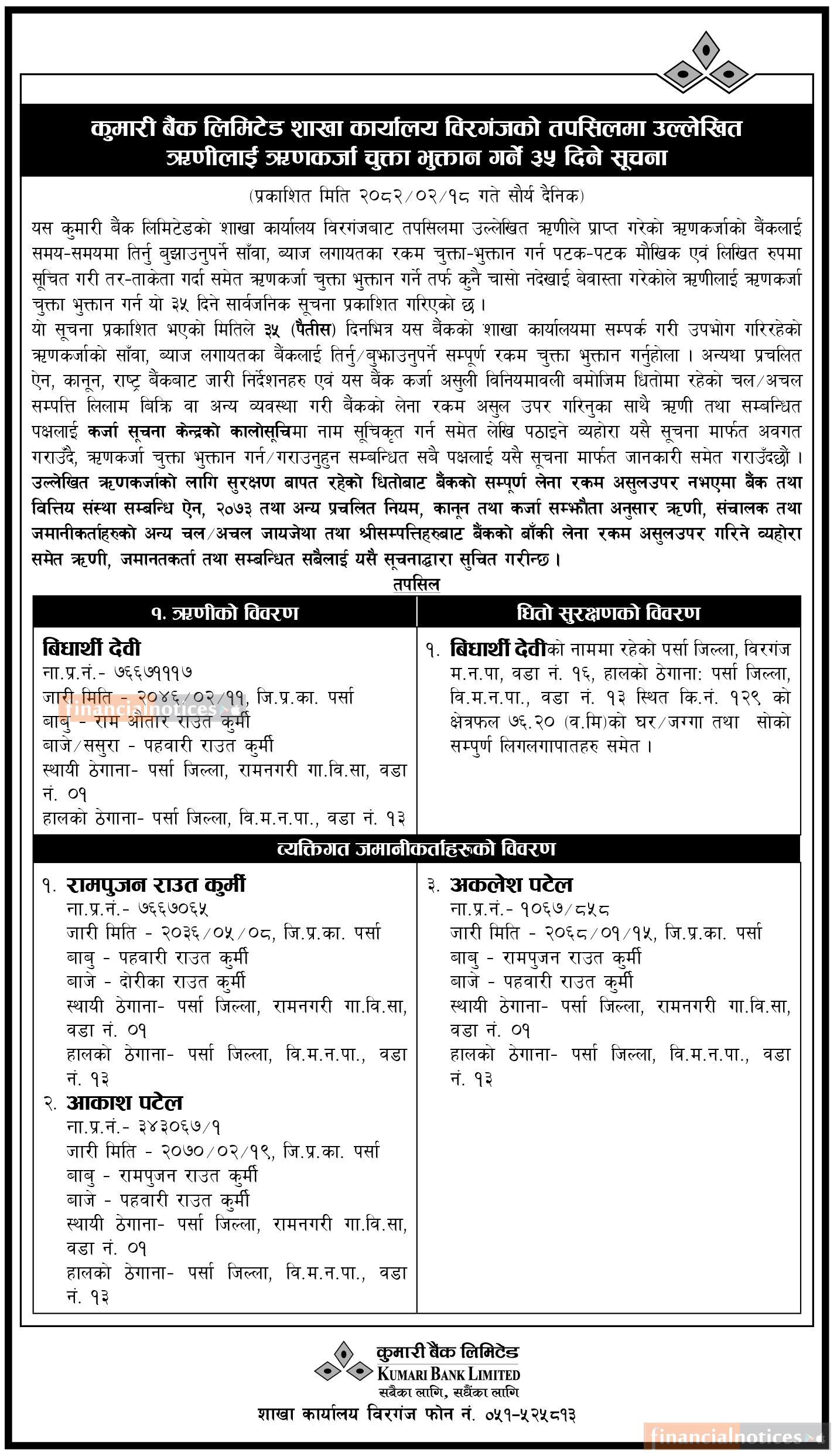 विरगंजको तपसिलमा उल्लेखित ऋणीहरुलाई ऋणकर्जा चुक्ता भुक्तान गर्ने ३५ दिने सूचना