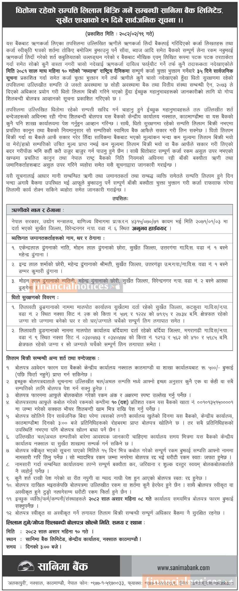 धितोमा रहेको सम्पत्ति लिलाम बिक्री गर्ने सम्बन्धी सानिमा बैंकको २१ दिने सूचना