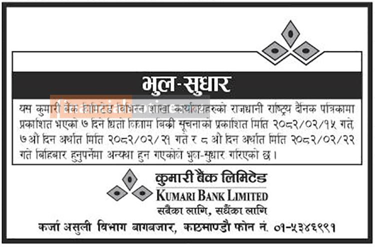 भुल सुधार गरिएको बारे कुमारी बैंकको सूचना