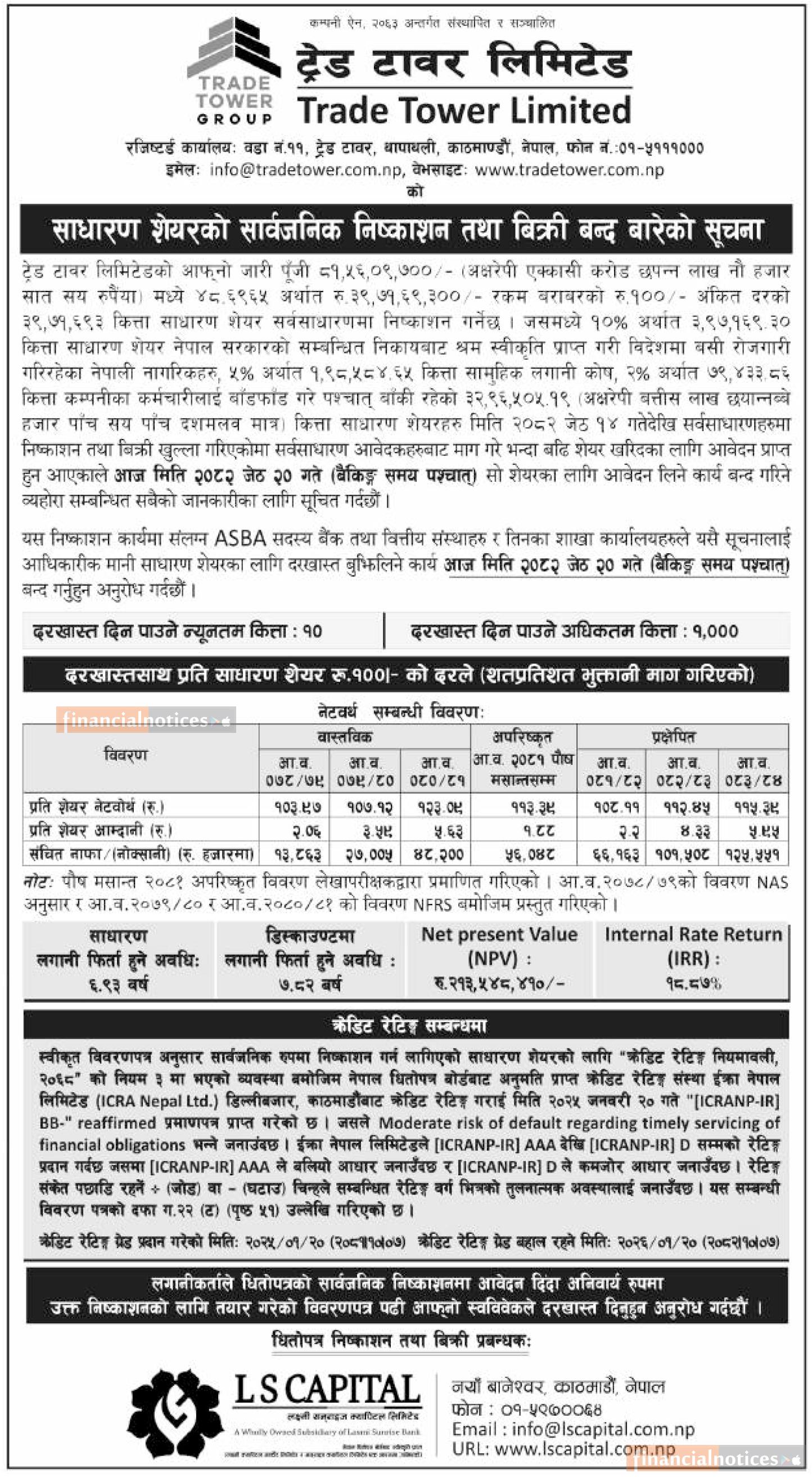 ट्रेड टावरको आईपीओमा आवेदन दिने आज अन्तिम दिन सम्बन्धी सूचना
