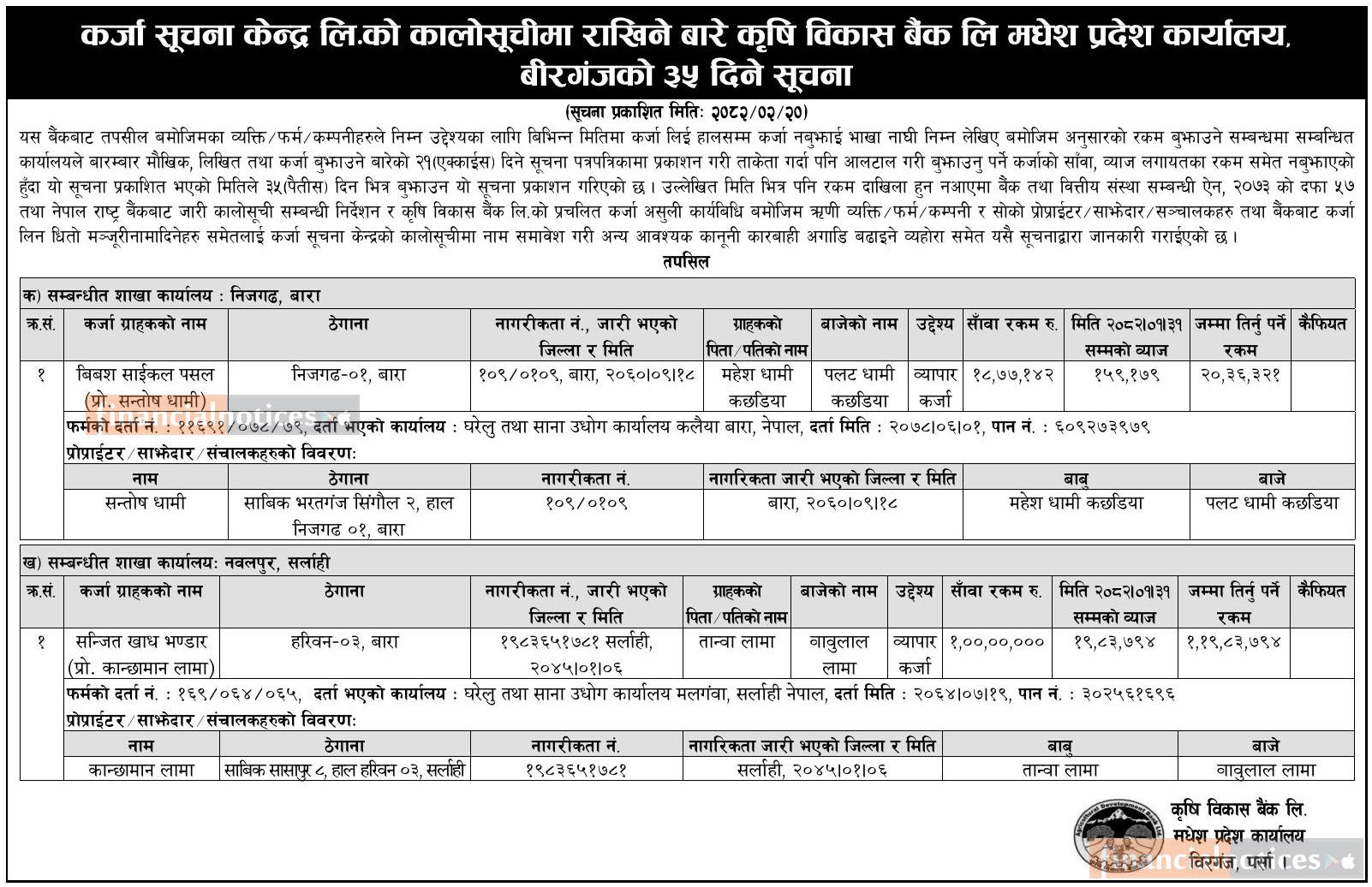 कालो सूचीमा राखिने बारेको कृषि विकास बैंकको जरुरी सूचना