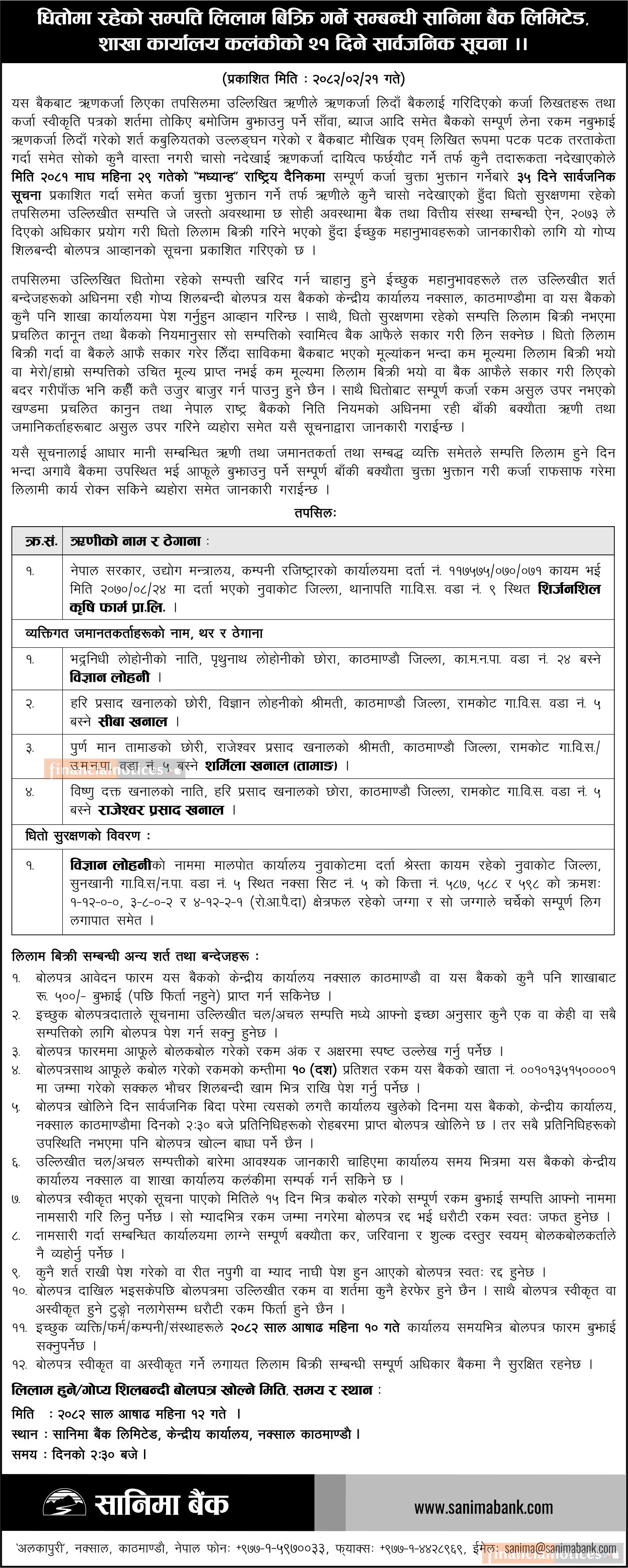 धितोमा रहेको सम्पत्ति लिलाम बिक्री सम्बन्धी सानिमा बैंकको सूचना