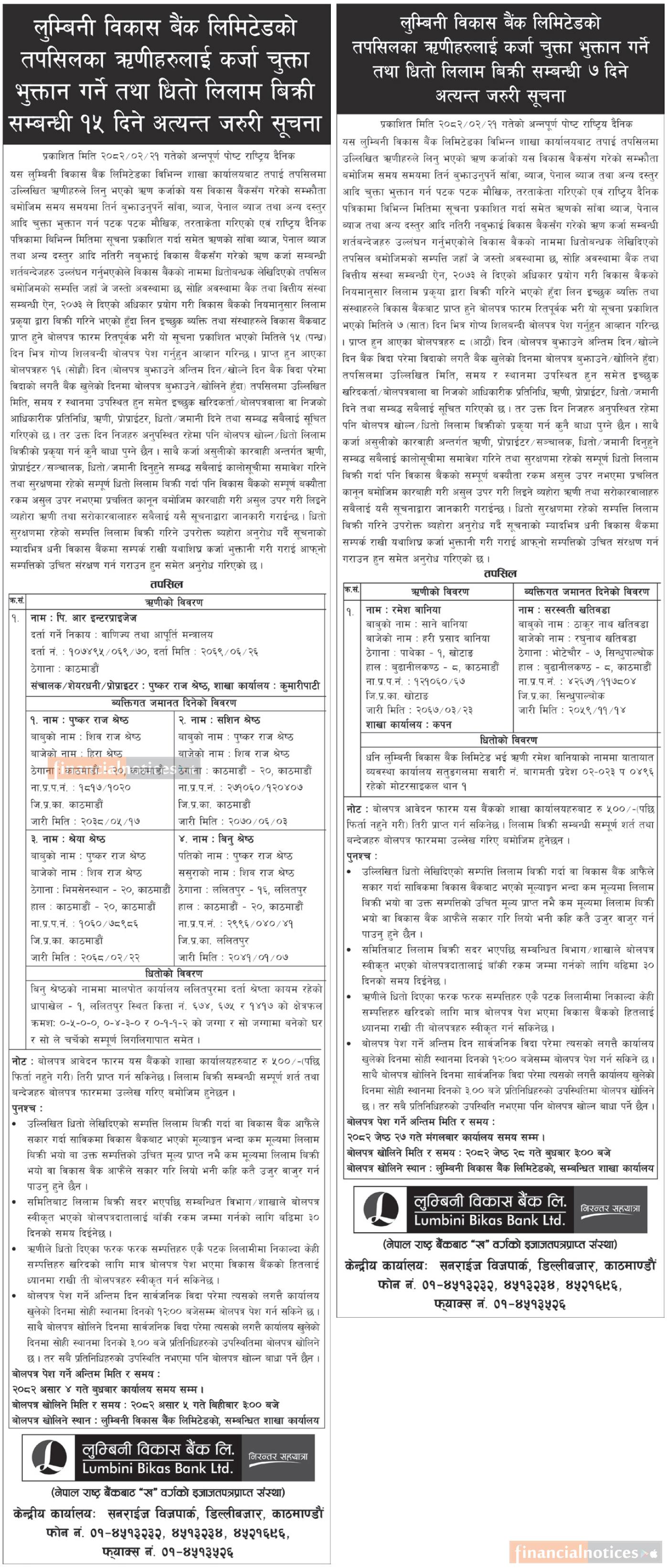 ऋणीहरुलाई कर्जा चुक्ता भुक्तान गर्ने तथा धितो लिलाम बिक्री सम्बन्धी ७ र १५ दिने सूचना