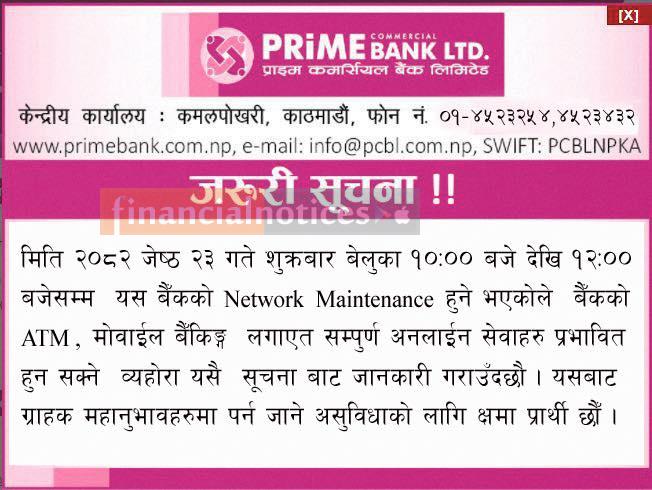 प्राइम कमर्सियल बैंकको विभिन्न अनलाईन सेवाहरु अवरुद्ध हुने सम्बन्धी जरुरी सूचना