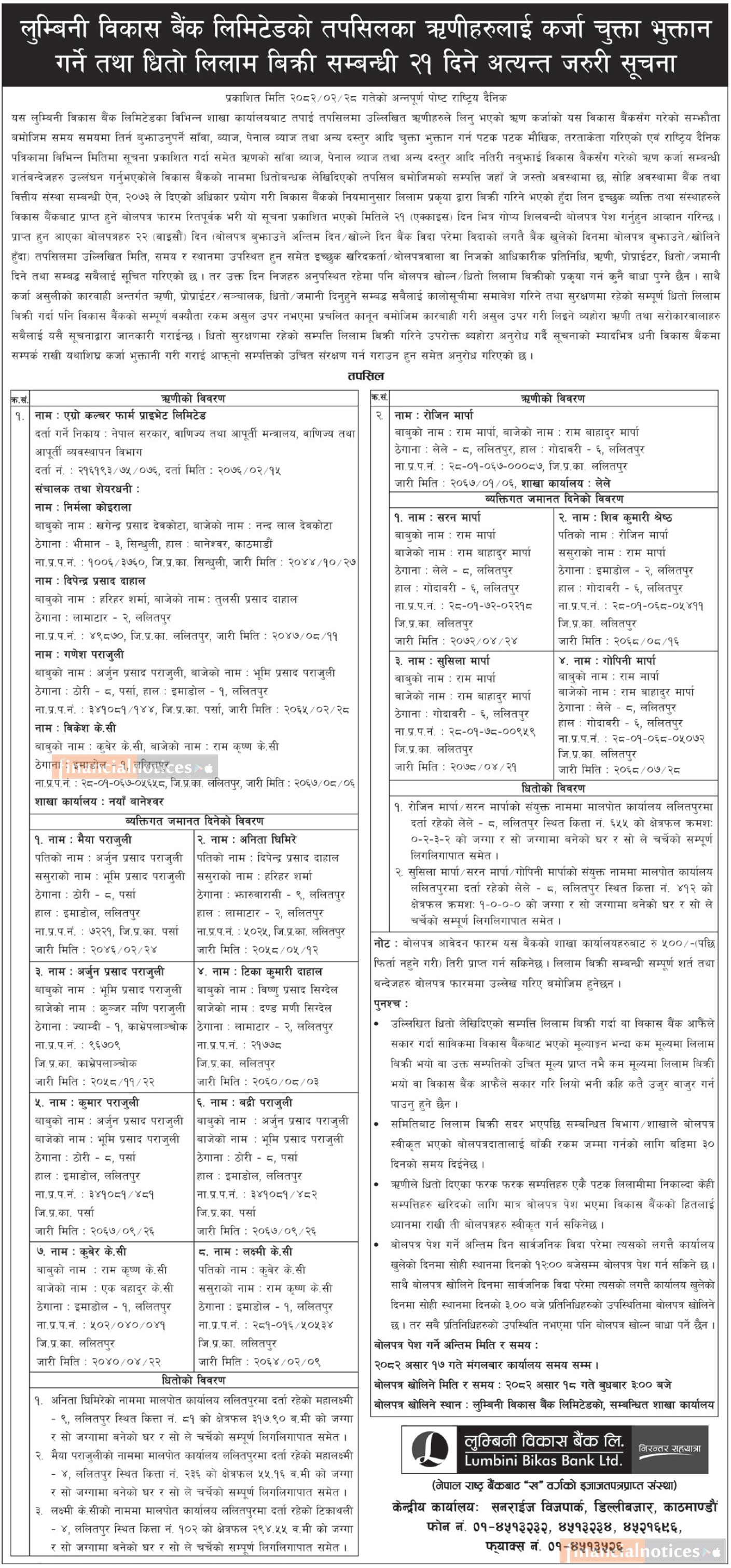 ऋणीहरुलाई कर्जा चुक्ता भुक्तान गर्ने तथा धितो लिलाम बिक्री सम्बन्धी २१ दिने सूचना