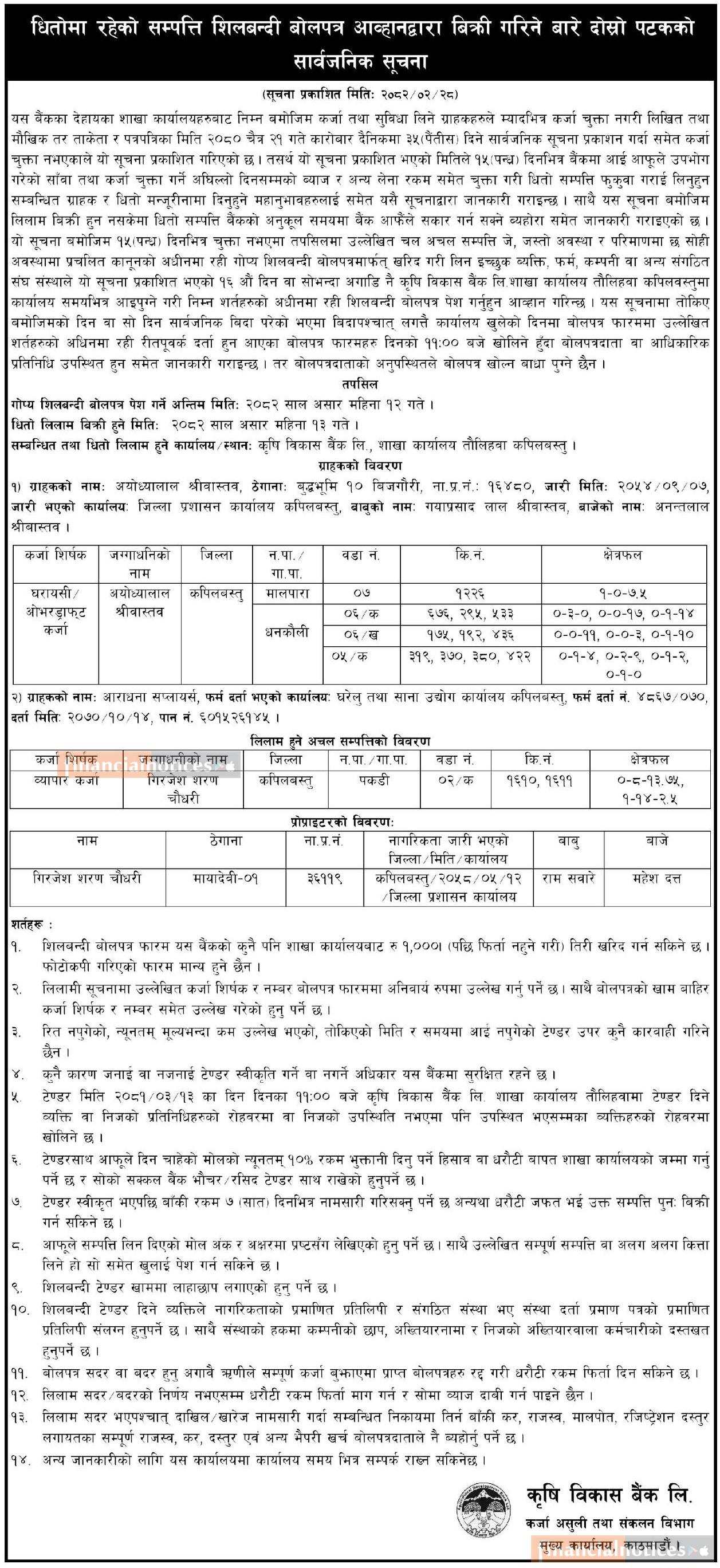 धितोमा रहेको सम्पत्ति शिलबन्दी बोलपत्र आव्हानद्धारा बिक्री गर्ने बारे दोस्रो पटकको सूचना