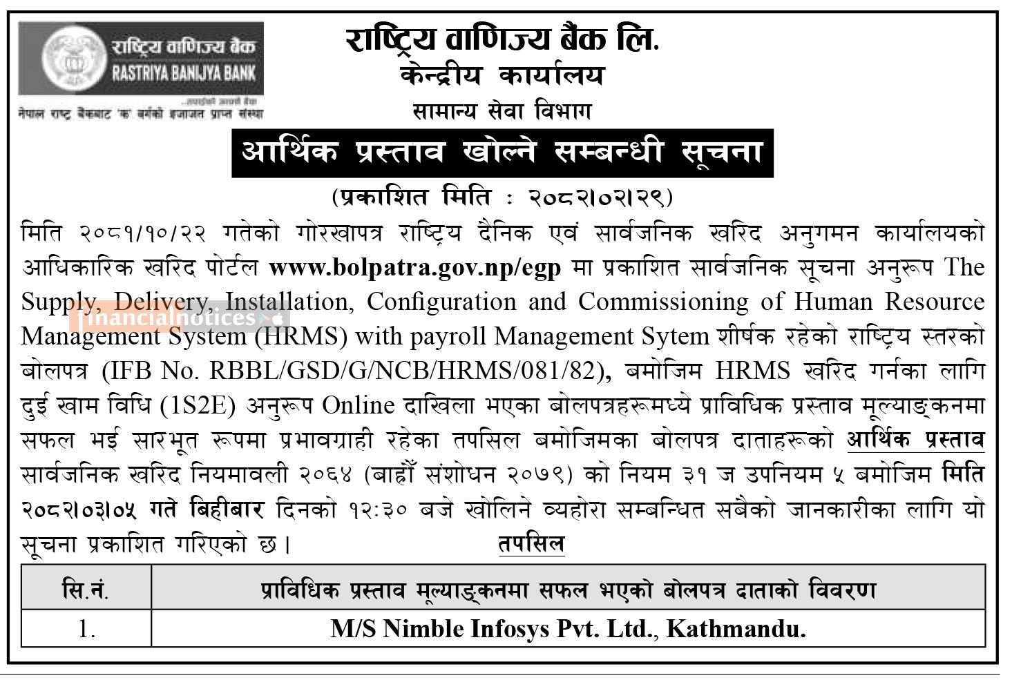 आर्थिक प्रस्ताव खोल्ने सम्बन्धी सूचना