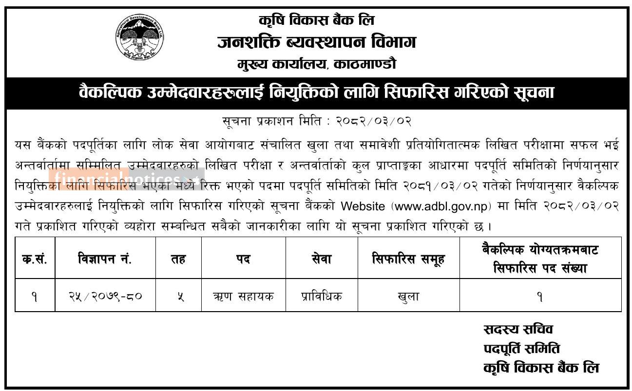 कृषि विकास बैंकको नियुक्तिका लागि सिफारिस गरिएको सम्बन्धी सूचना -