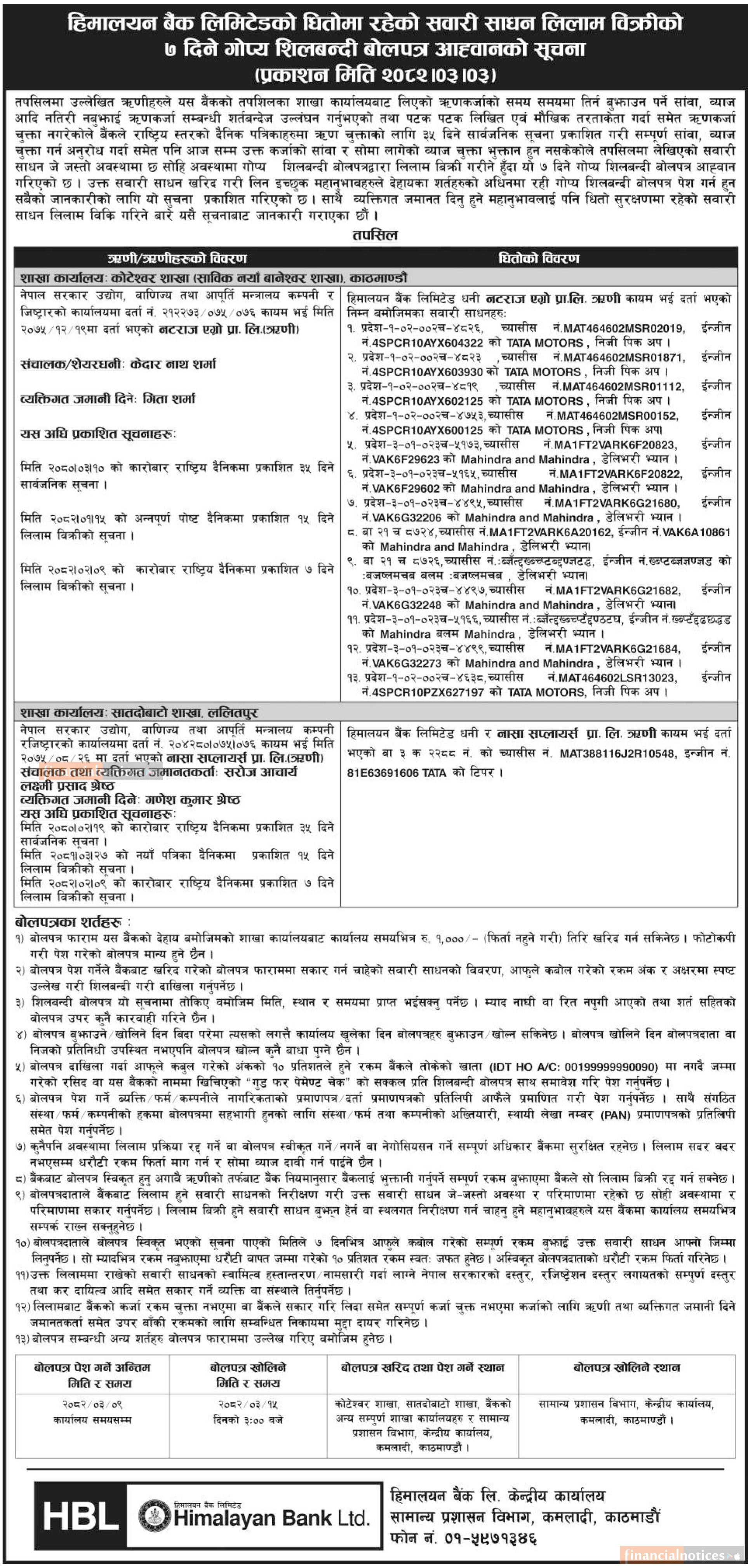 धितोमा रहेको सवारी साधन लिलाम बिक्रीको ७ दिने गोप्य शिलबन्दी बोलपत्र आव्हानको सूचना