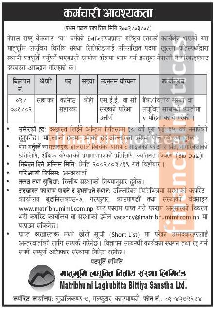मातृभूमि लघुवित्तमा कर्मचारी आवश्यकता सम्बन्धी सूचना - JOB Opportunities -