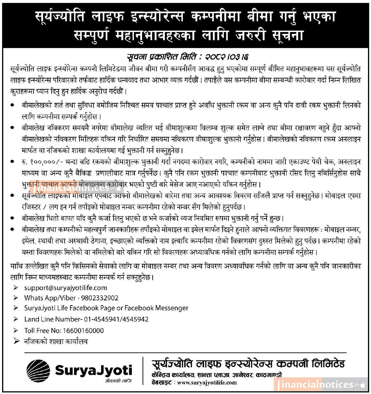 बीमा गर्ने ग्राहाकहरुलाई सूर्यज्योति लाईफको जरुरी सूचना