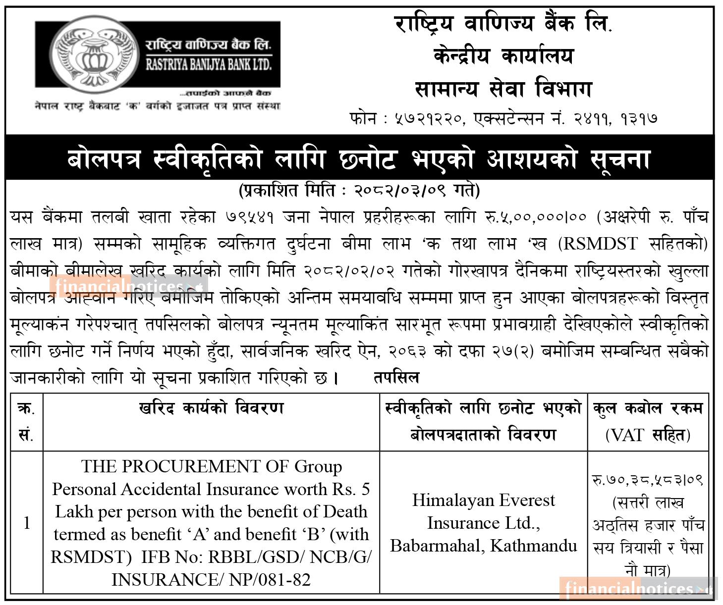 बोलपत्र स्वीकृतीको लागि छनोट भएको आशयको सूचना