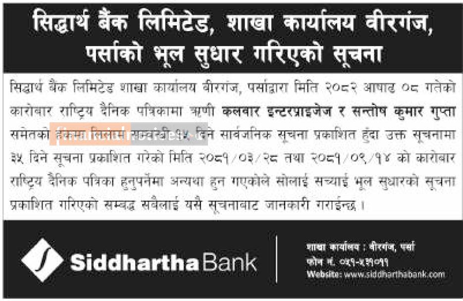 सिद्धार्थ बैंक विरगंज पर्साको भुल सुधार गरिएको सूचना