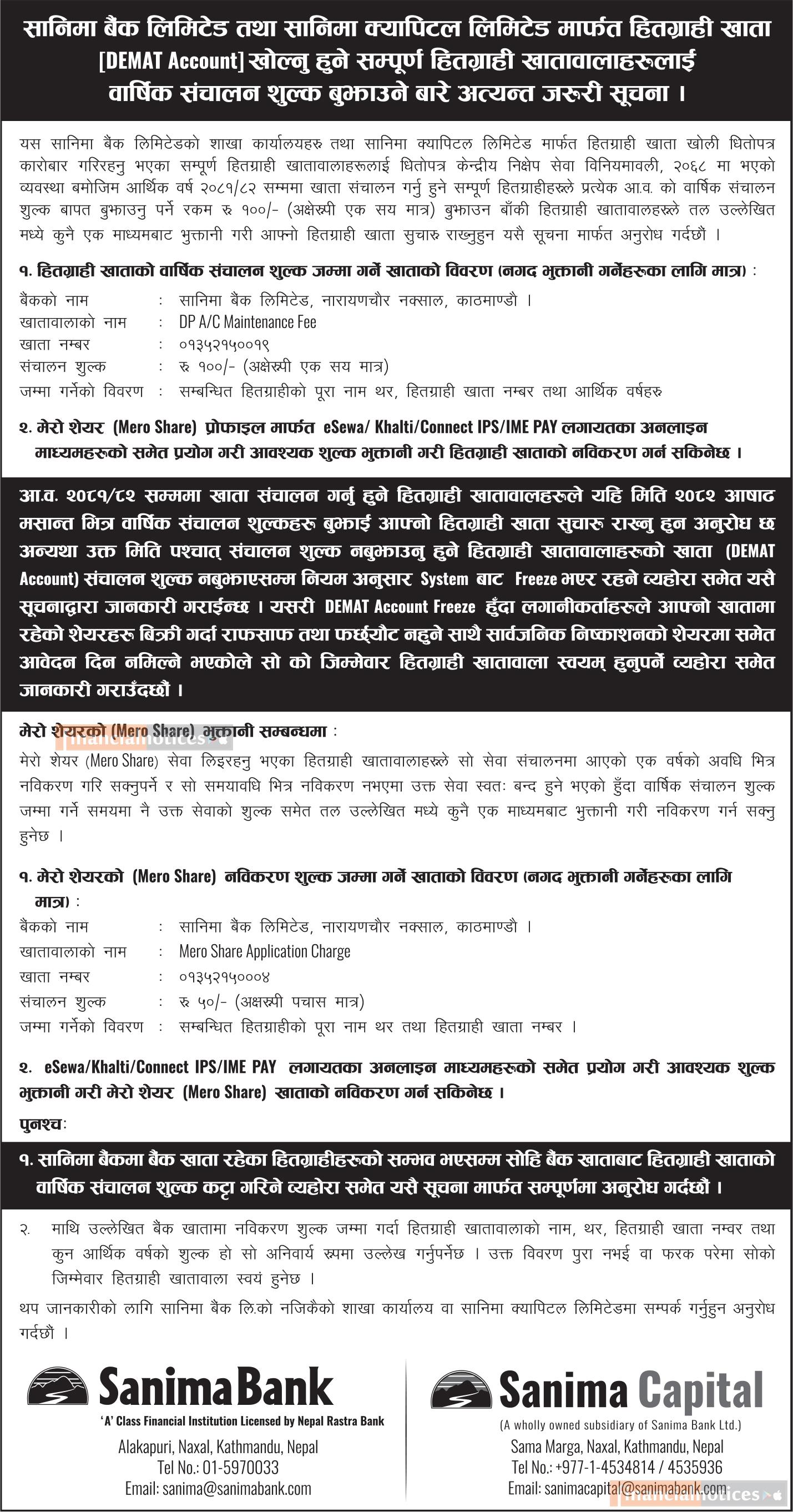 हितग्राही खाताको वार्षिक संकलन शुल्क बुझाउने बारेको सूचना