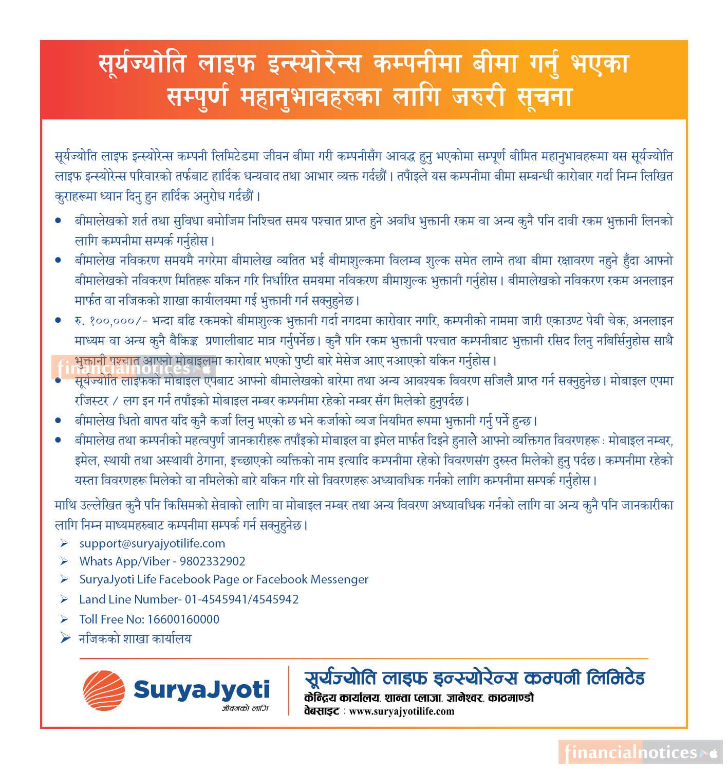 सूर्यज्योति लाइफ इन्स्योरेन्समा बीमा गर्नु भएका सम्पूर्ण बीमितहरूको जानकारीको लागि जरुरी सूचना