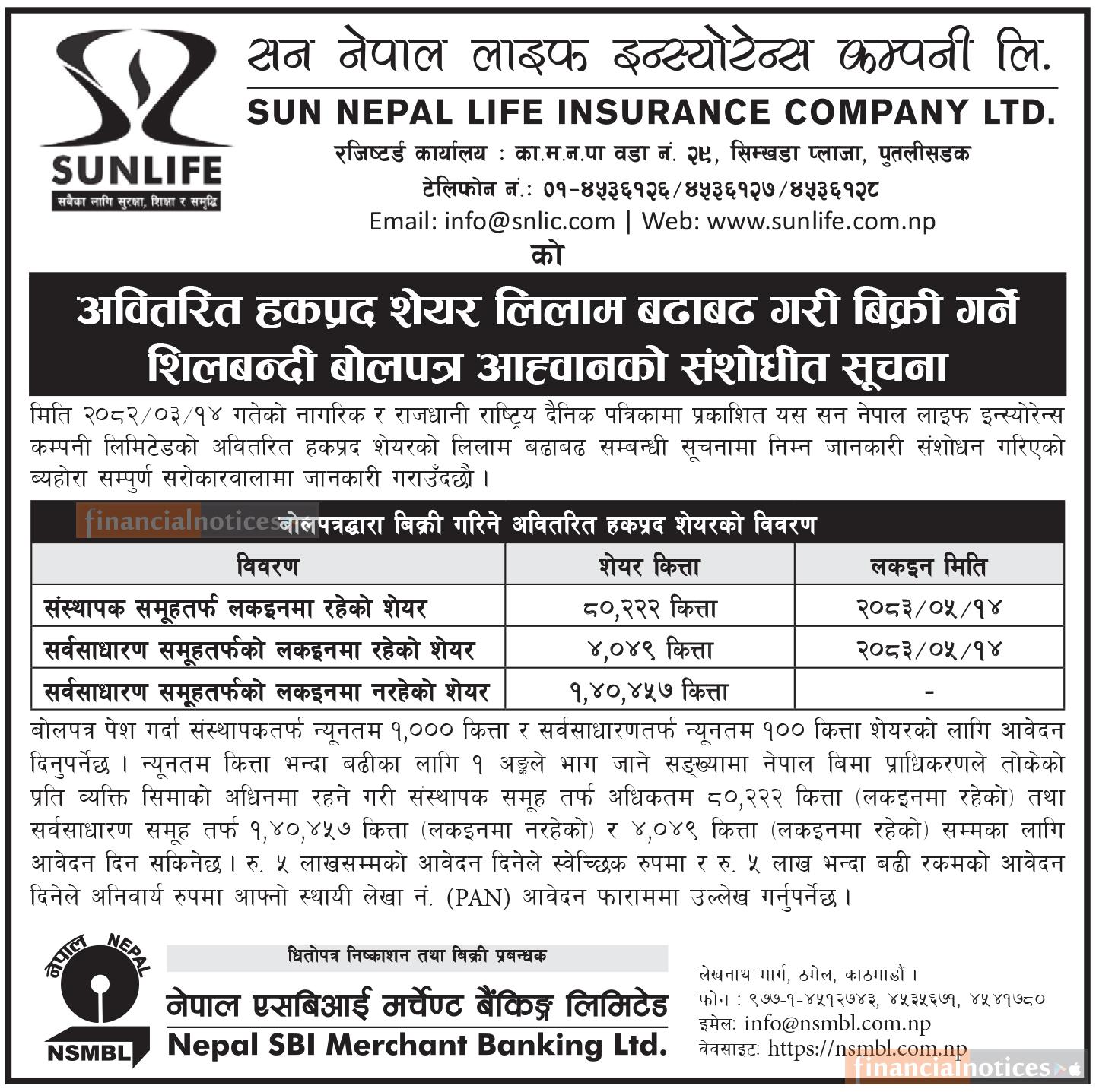 अवितरित हकप्रद शेयर लिलाम बढाबढ गरि बिक्री गर्ने शिलबन्दी बोलपत्र आव्हानको संसोधित सूचना