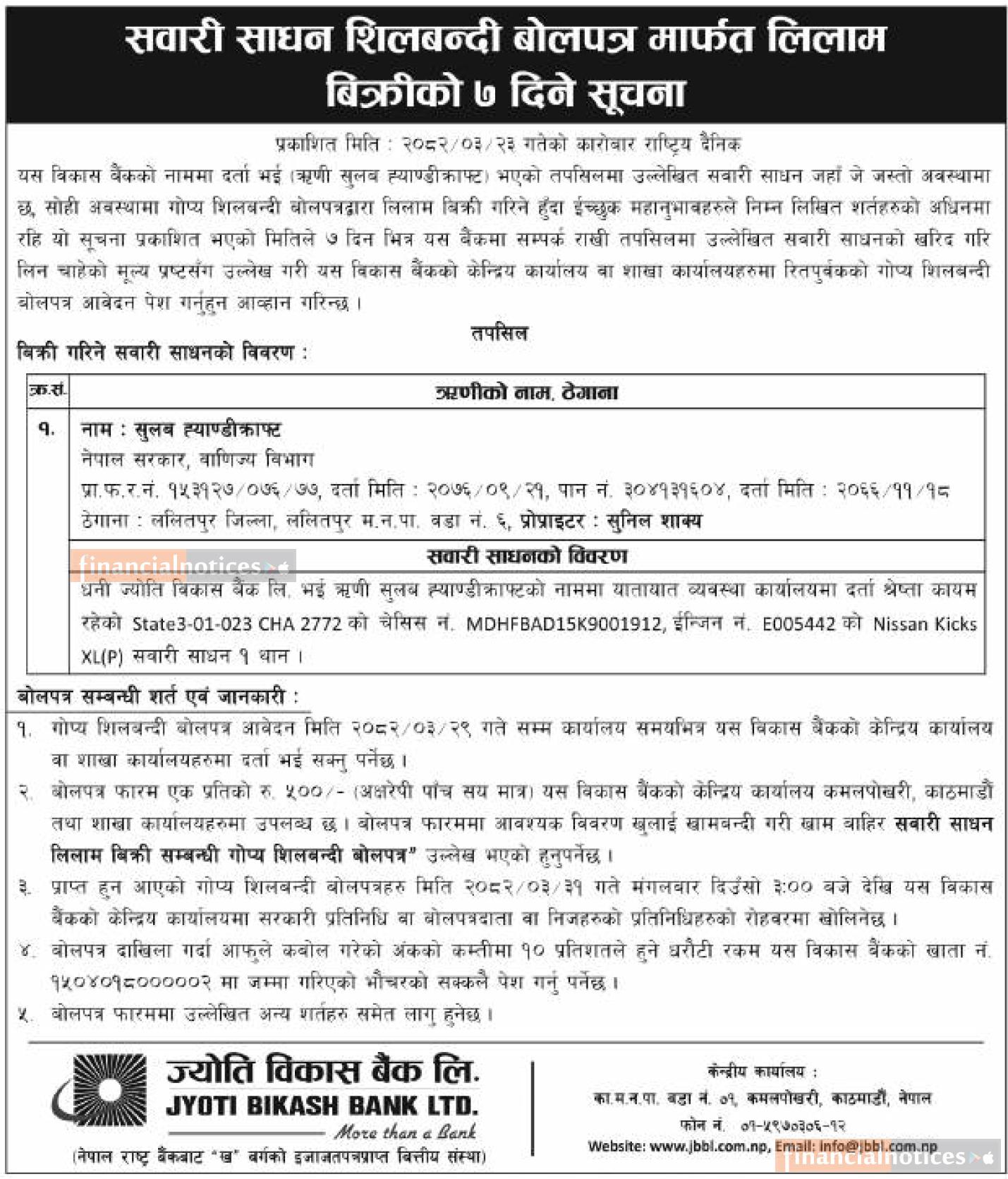 सवारी साधन शिलबन्दी बोलपत्र मार्फत लिलाम बिक्रीको ७ दिने सूचना