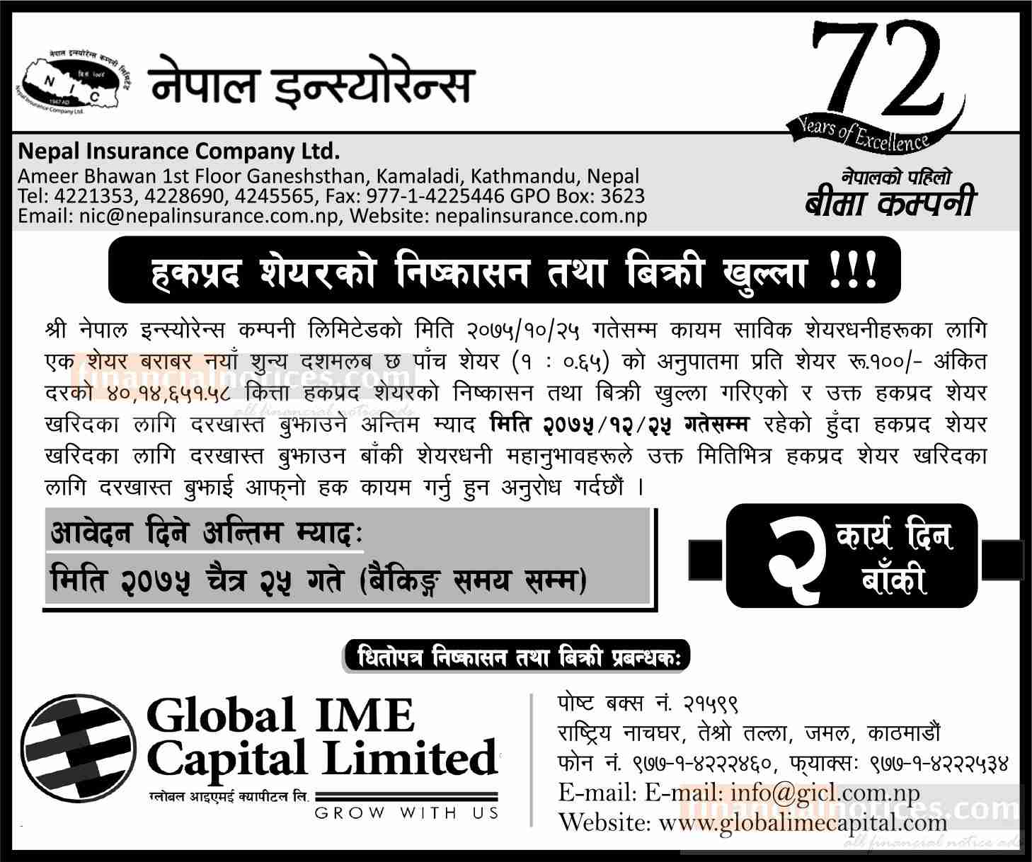 हकप्रद शेयरको लागि आवेदन दिने अन्तिम दिन