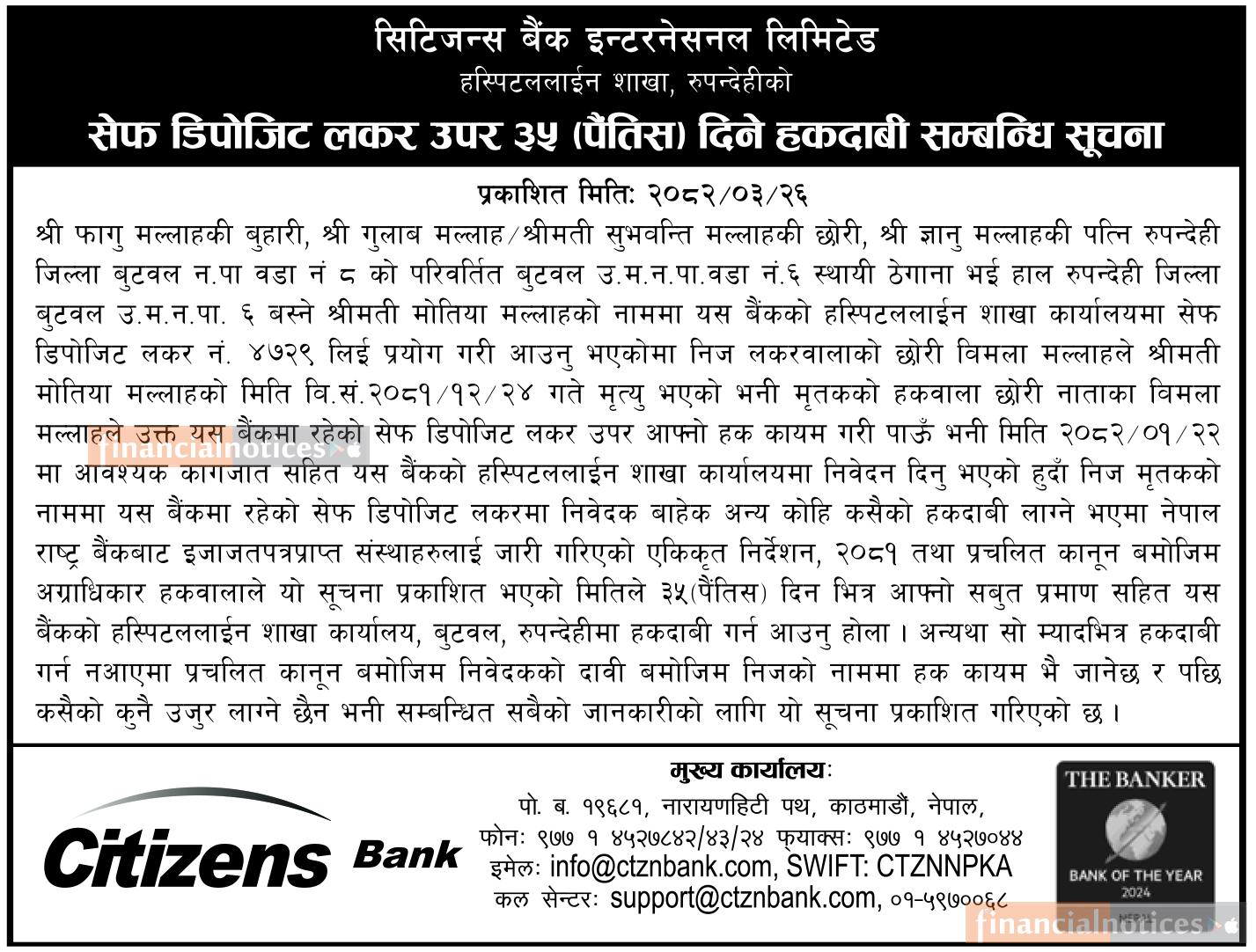 सेफ डिपोजिट लकर उपर ३५ दिने हकदावी सम्बन्धी सूचना