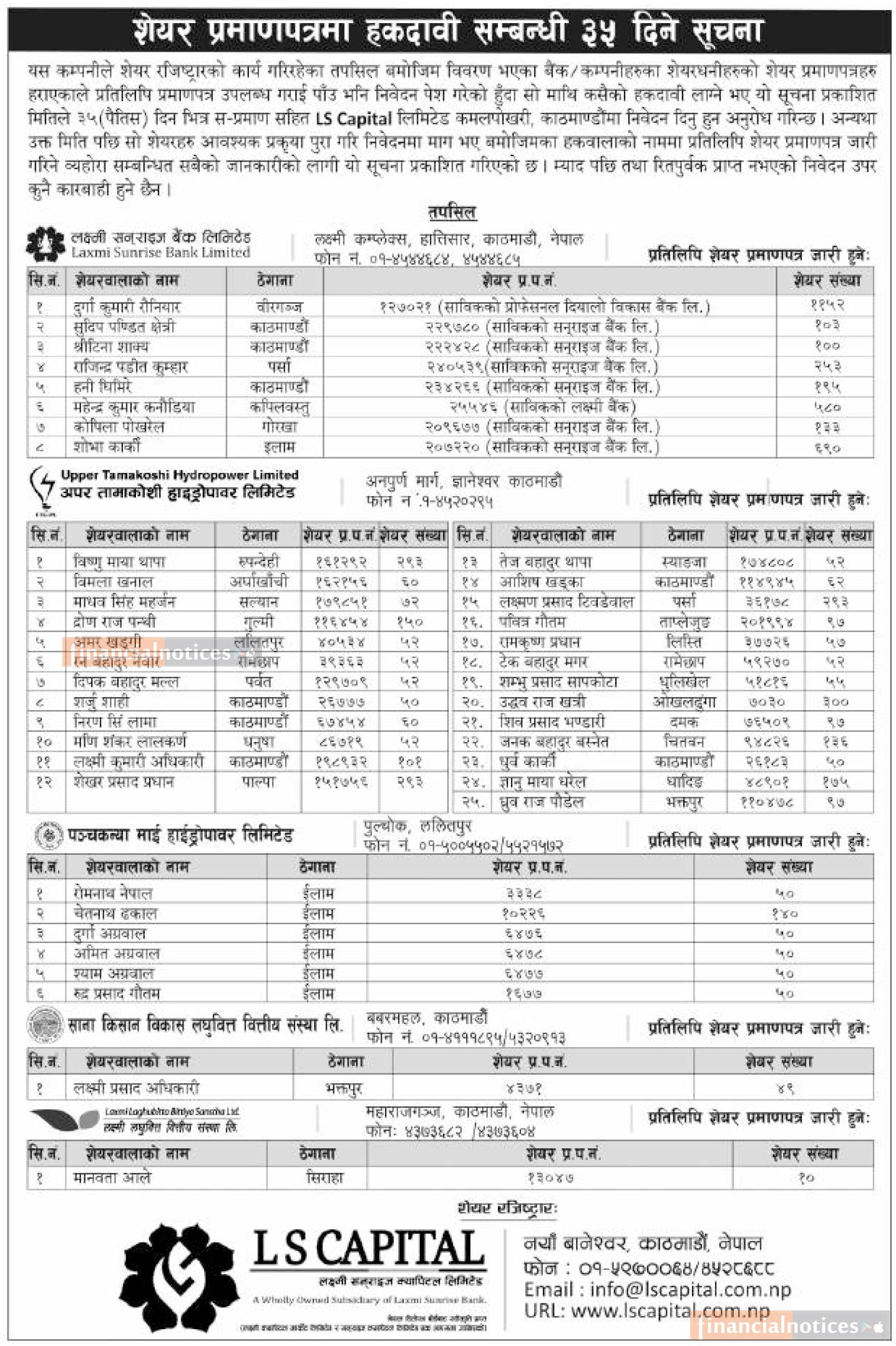 शेयर प्रमाणपत्रमा हकदावी सम्बन्धी ३५ दिने सूचना