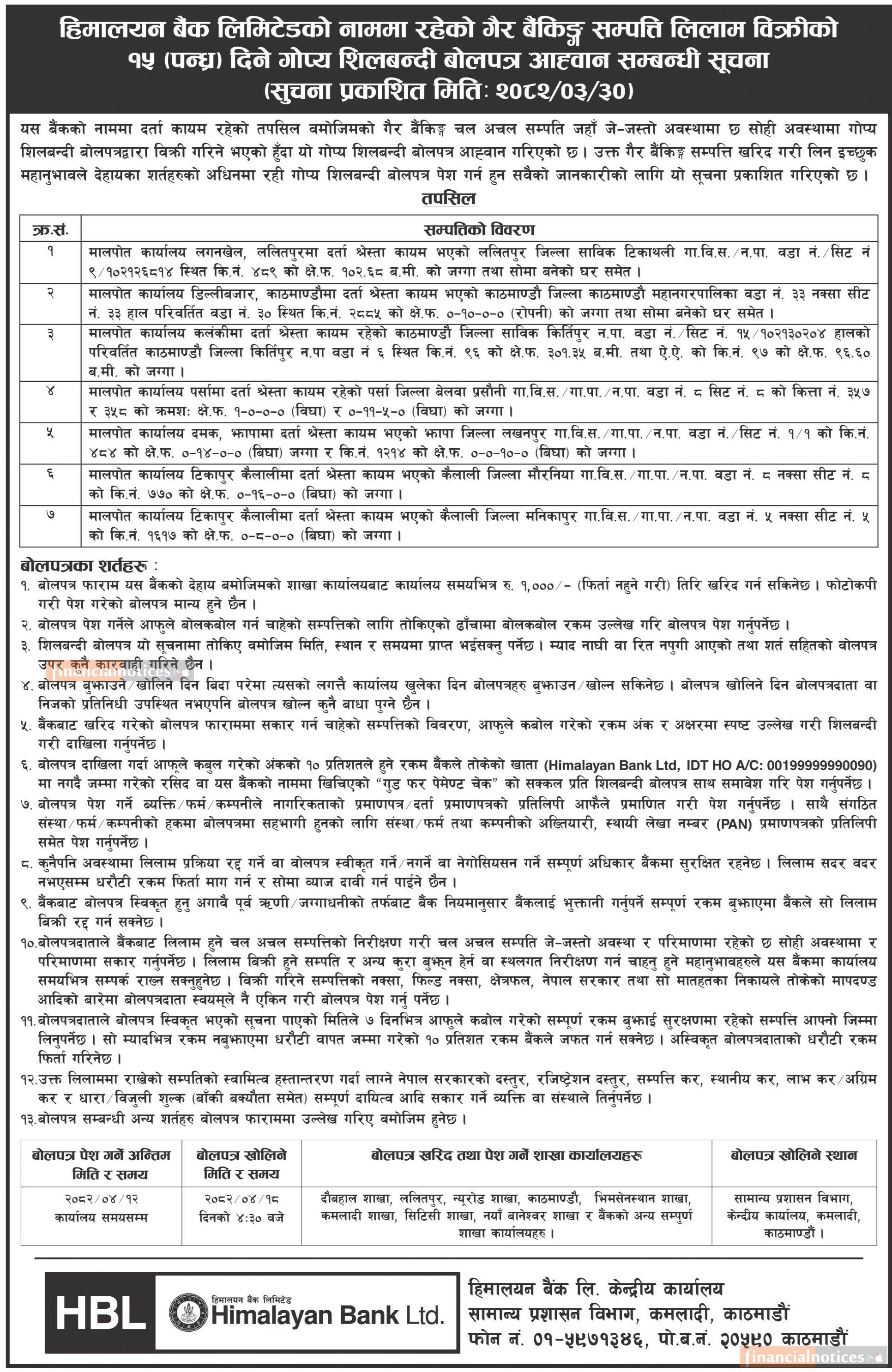 गैह्र बैंकिङ्ग सम्पत्ति लिलाम बिक्रीको १५ दिने गोप्य शिलबन्दी बोलपत्र आव्हान सम्बन्धी सूचना