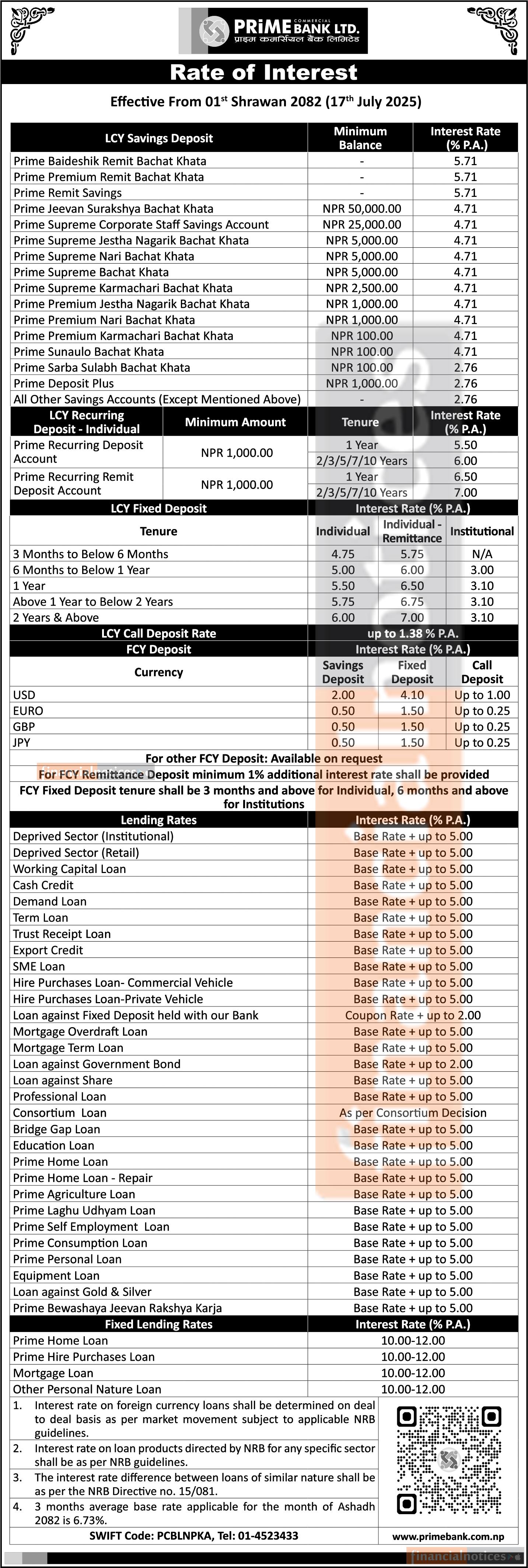 Prime Commercial बैंकको ब्याजदर फेरियो - श्रावण १ गतेदेखि कुन खातामा कति पाइन्छ?