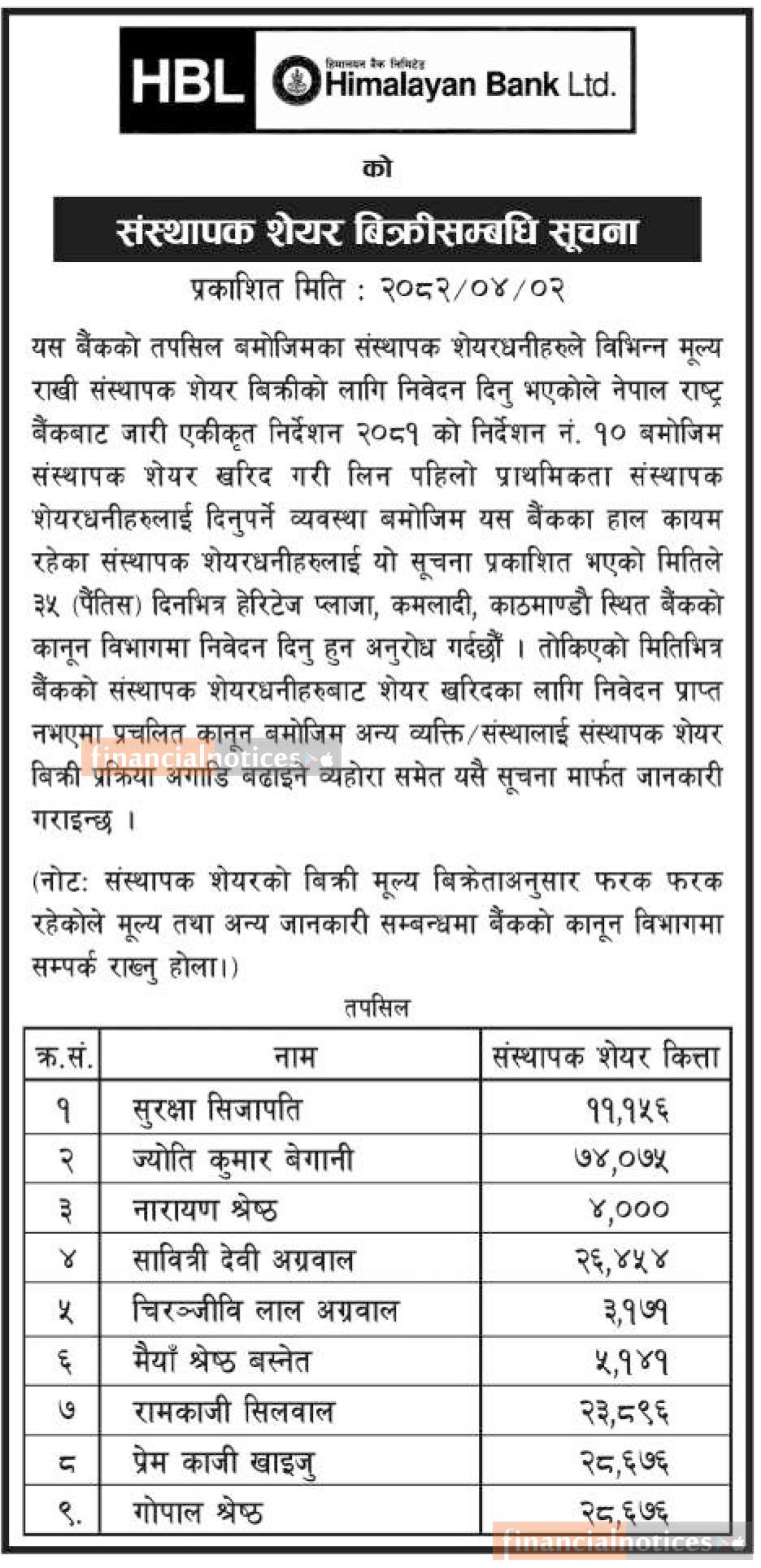 संस्थापक शेयर बिक्री सम्बन्धी सूचना