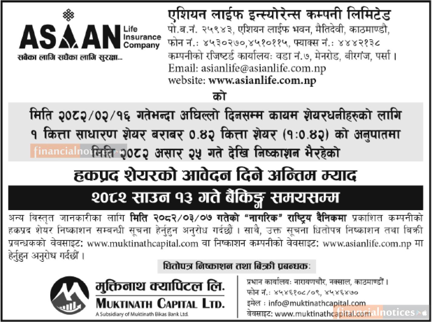 एशियन लाइफ इन्स्योरेन्सको हकप्रद शेयरमा साउन १३ गते सम्म आवेदन दिन सकिने बारेको सुचना