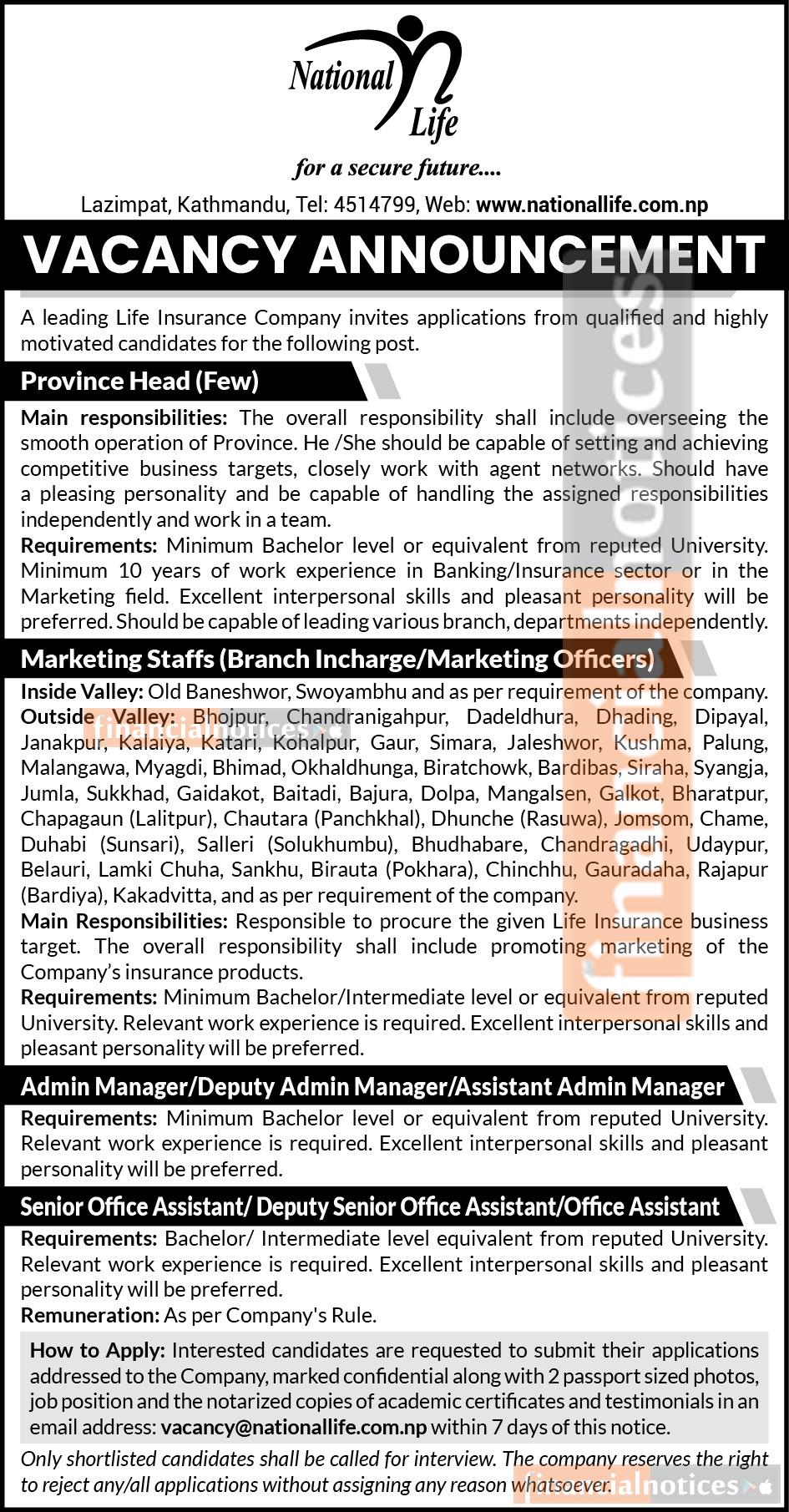 Kathmandu, July 28 – National Life Insurance Company, a leading life insurance provider in Nepal, has announced a wide range of career opportunities for qualified and motivated individuals. The company is seeking to fill several key positions to support its growing operations across various provinces and districts.