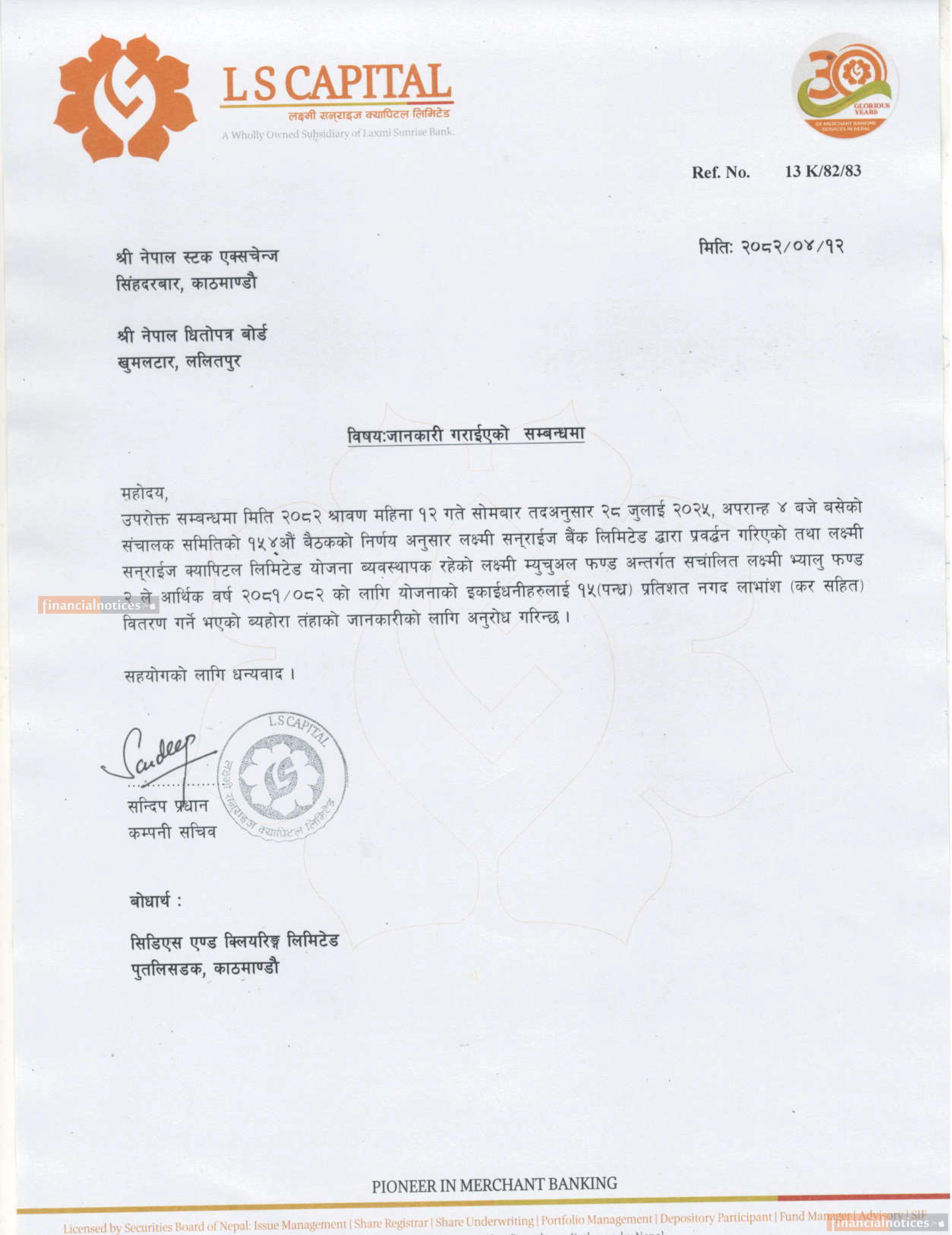 लक्ष्मी भ्यालु फण्ड २ ले प्रतिफल वितरण गर्ने सम्बन्धी सूचना