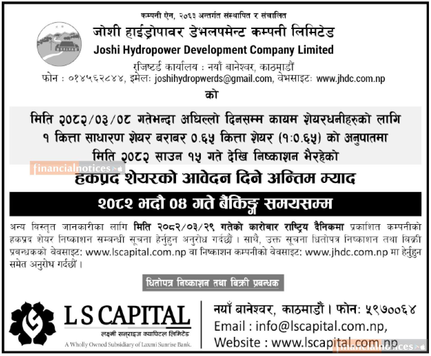 जोशी हाइड्रोपावरको हकप्रद शेयरमा भदौ ४ गतेसम्म आवेदन दिन सकिने सम्बन्धी सूचना