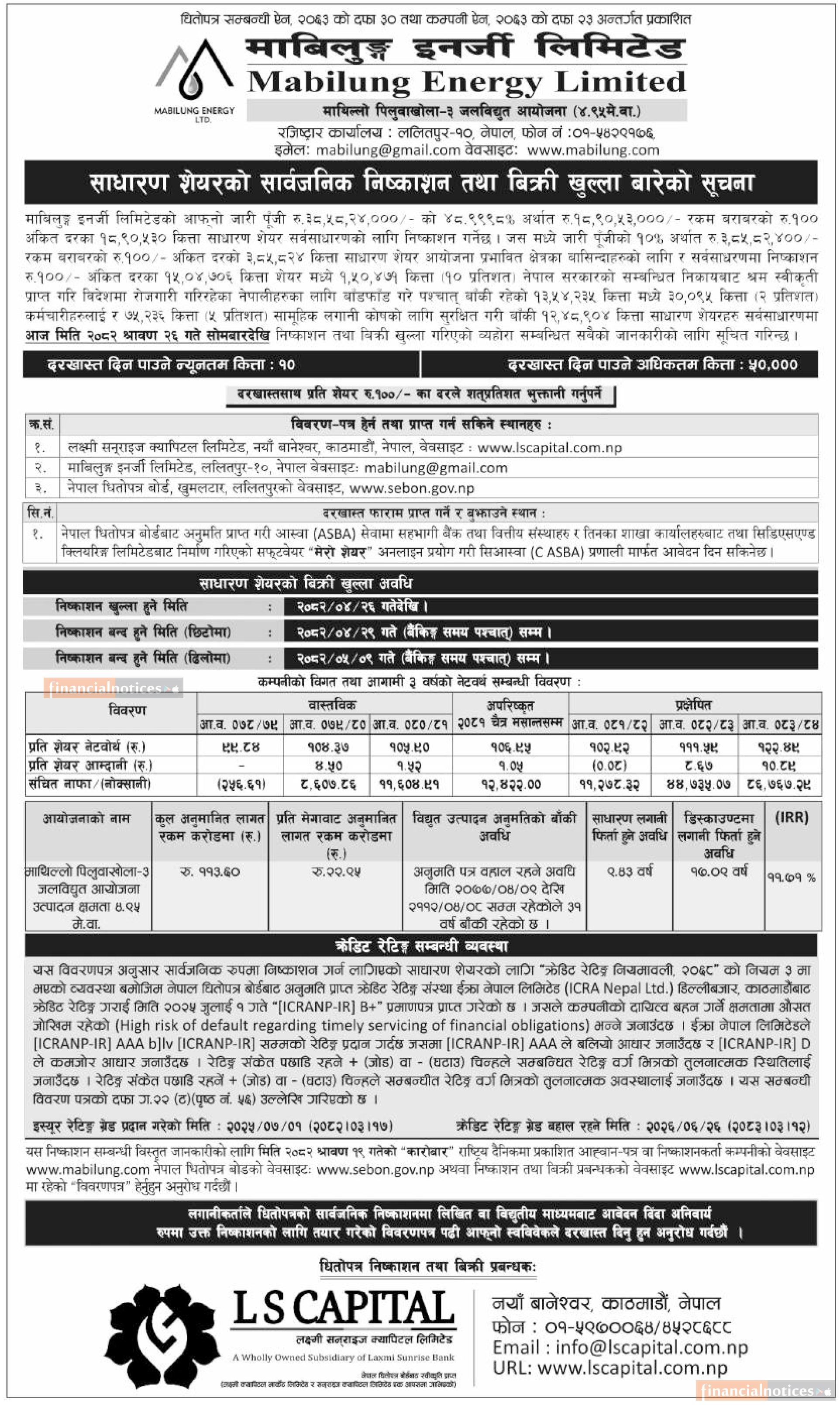 माबिलुङ्ग इनर्जी लिमिटेडको आईपीओमा सर्वसाधारणले आजदेखि आवेदन दिन सकिने सम्बन्धी सूचना