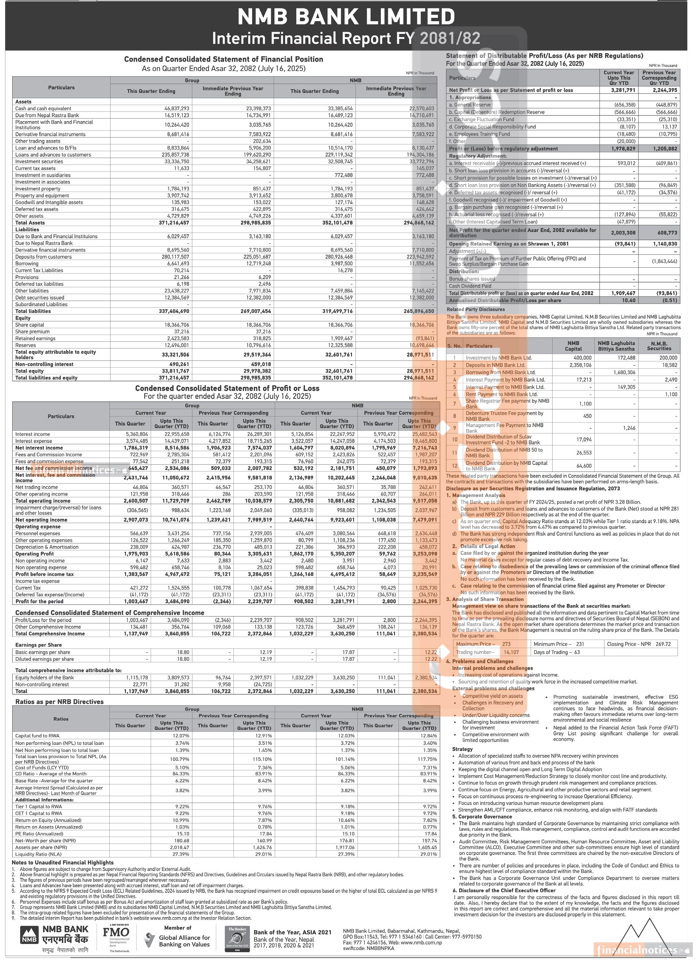एनएमबी बैंक लिमिटेडले गत आर्थिक वर्षको चौथो त्रैमाससम्मको अपरिष्कृत वित्तीय विवरण प्रकाशित गरेको छ। विवरण अनुसार बैंकले गत आर्थिक वर्षको असार मसान्तसम्ममा ३ अर्ब २८ करोड १७ लाख रुपैयाँ खुद नाफा कमाएको छ। अघिल्लो आर्थिक वर्षको सोही अवधिसम्ममा बैंकले २ अर्ब २४ करोड ४३ लाख रुपैयाँ खुद नाफा कमाएको थियो।