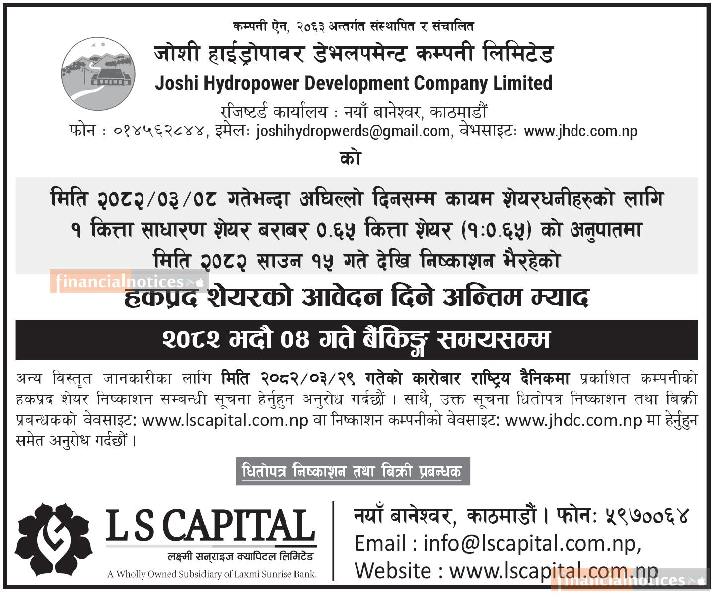 जोशी हाइड्रोपावरको हकप्रद सेयर आवेदन दिने अन्तिम म्याद भदौ ४ सम्म